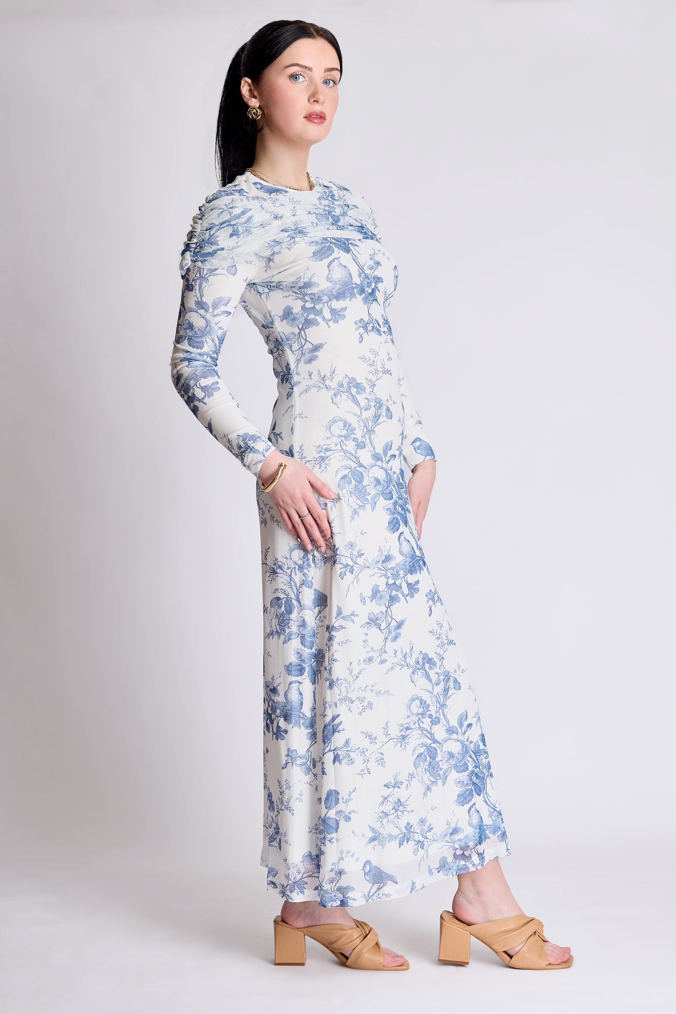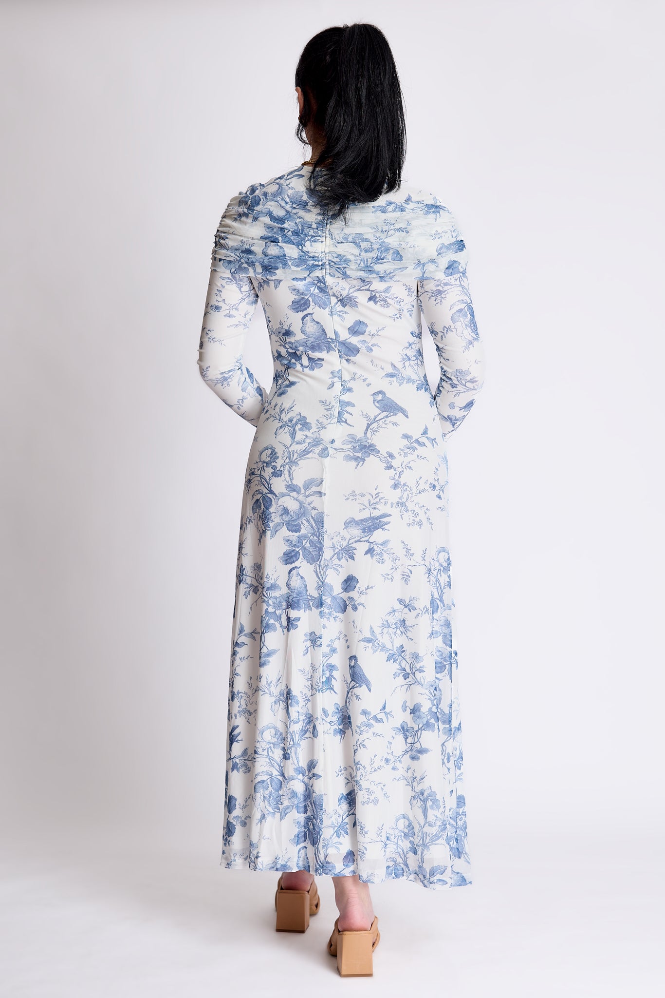 Experience effortless luxury with The Amalfi Dress, designed for the woman who balances ambition and elegance with ease. Crafted from exquisite stitch mesh with a cozy stretch lining, it offers breathability and comfort without compromising on style. The intricate blue toile print on an ivory base exudes vintage charm, making every detail feel timeless yet modern. Thoughtfully tailored with front and back darts, this dress flatters your silhouette, while the elegant draped shoulder detail adds a regal touch, creating a beautifully fluid and sophisticated look. With long fitted sleeves and a refined round neckline, The Amalfi Dress is the perfect blend of sophistication and versatility—ideal for intimate gatherings, elegant evenings, or simply elevating your everyday. Indulge in a piece that captures the essence of Dolce Vita living—because style isn’t just what you wear, it’s how you live.