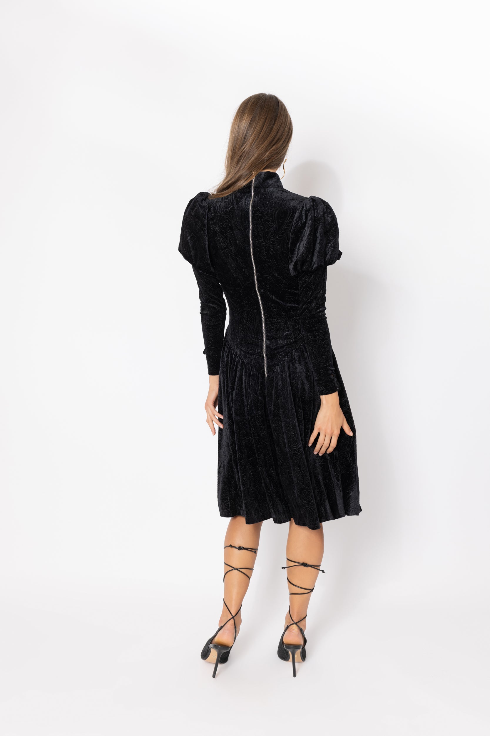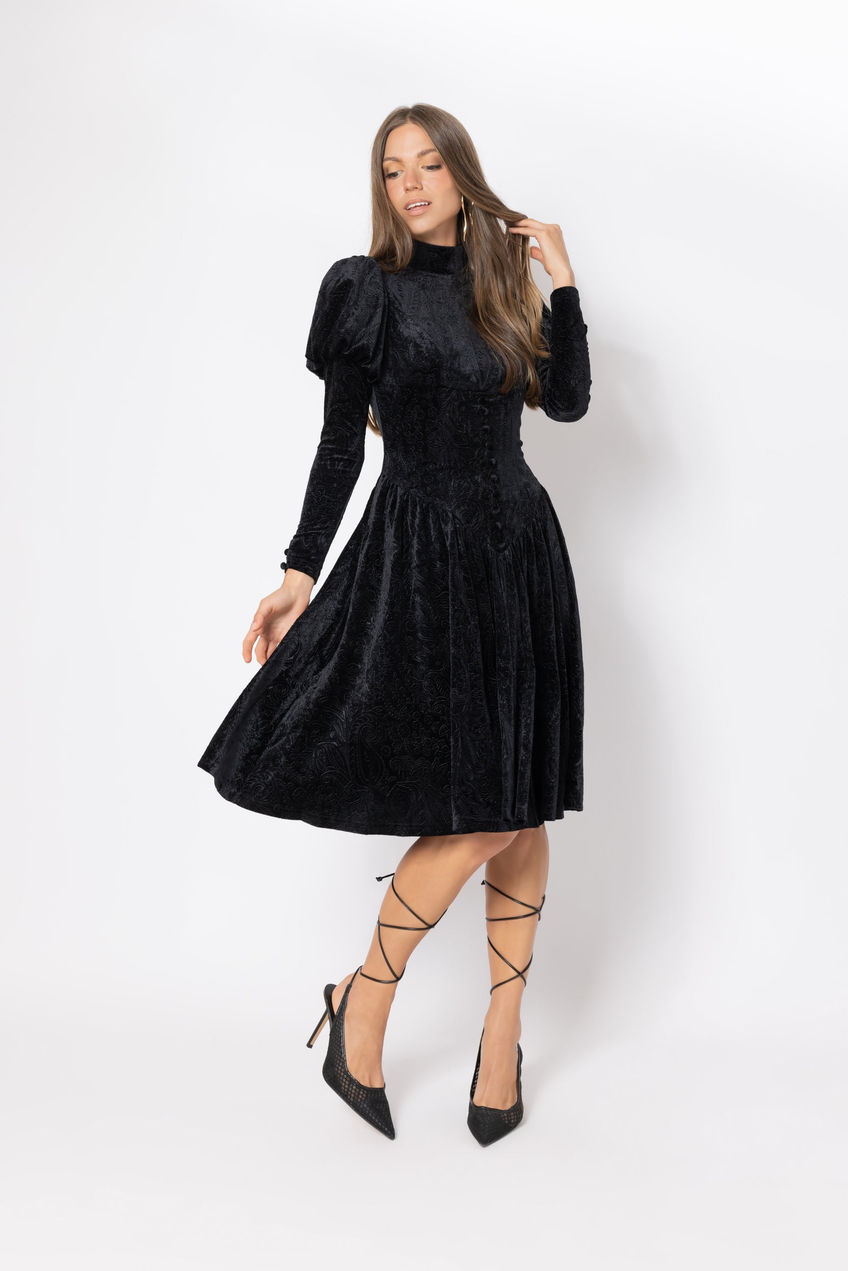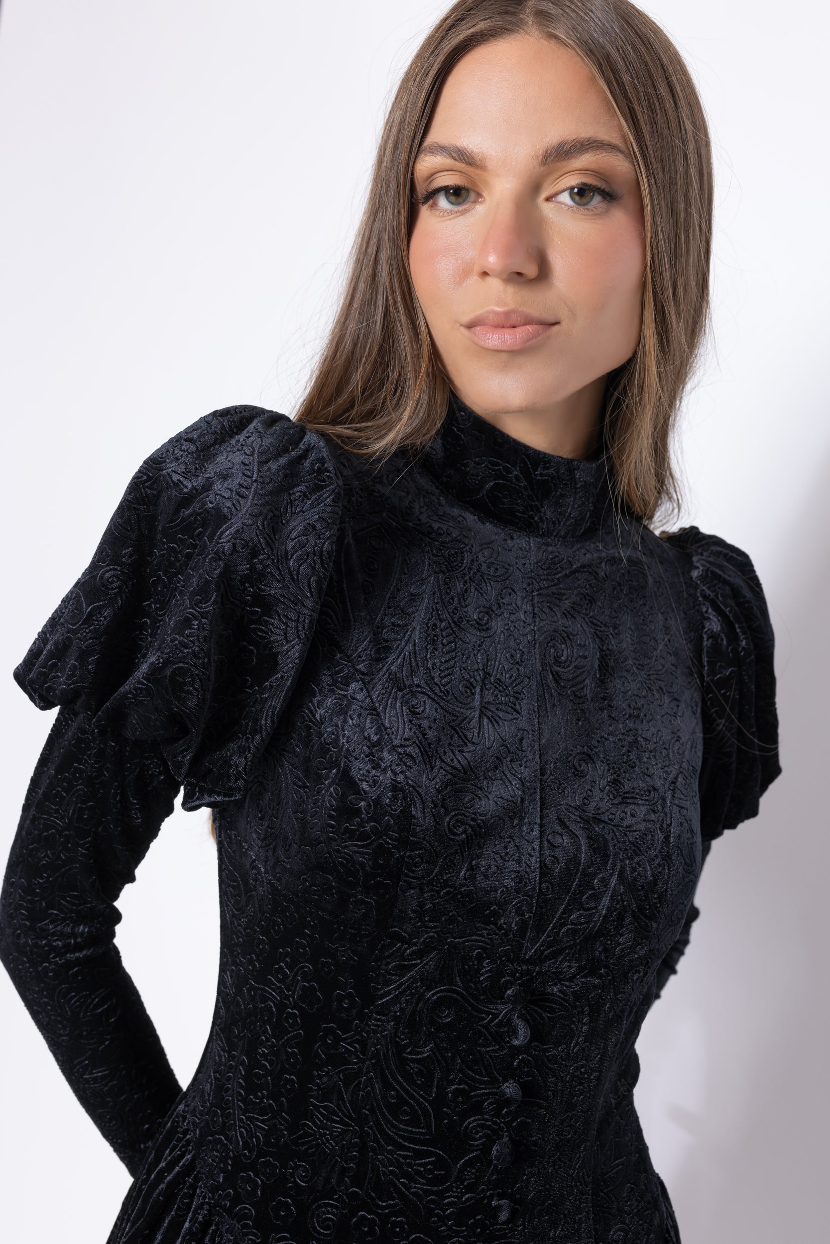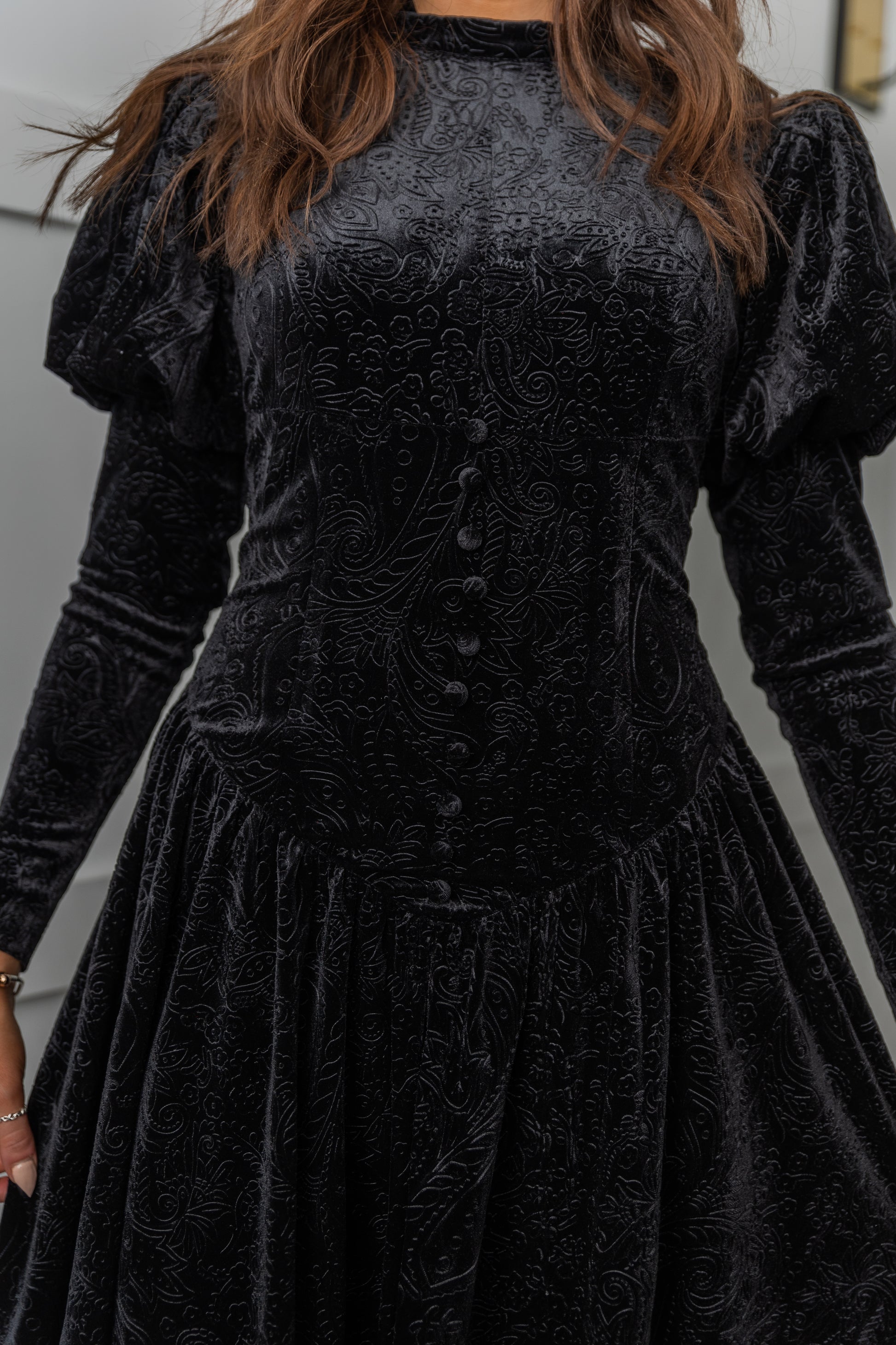 Elevate your elegance with the Aurora Dress – a true embodiment of opulence and intricate design. Crafted from luxurious black velour, its subtle crushed paisley pattern adds a touch of depth and texture. Meticulously curated, every element contributes to this masterpiece, from the V-shaped dropped waist that flatters your silhouette, to the embellished buttons adorning the paneled bodice. The romantic Juliet-style sleeves complete the picture, infusing an air of timeless romance. Step into a world of refined charm with the Aurora Dress – where sophistication meets unmatched craftsmanship.
