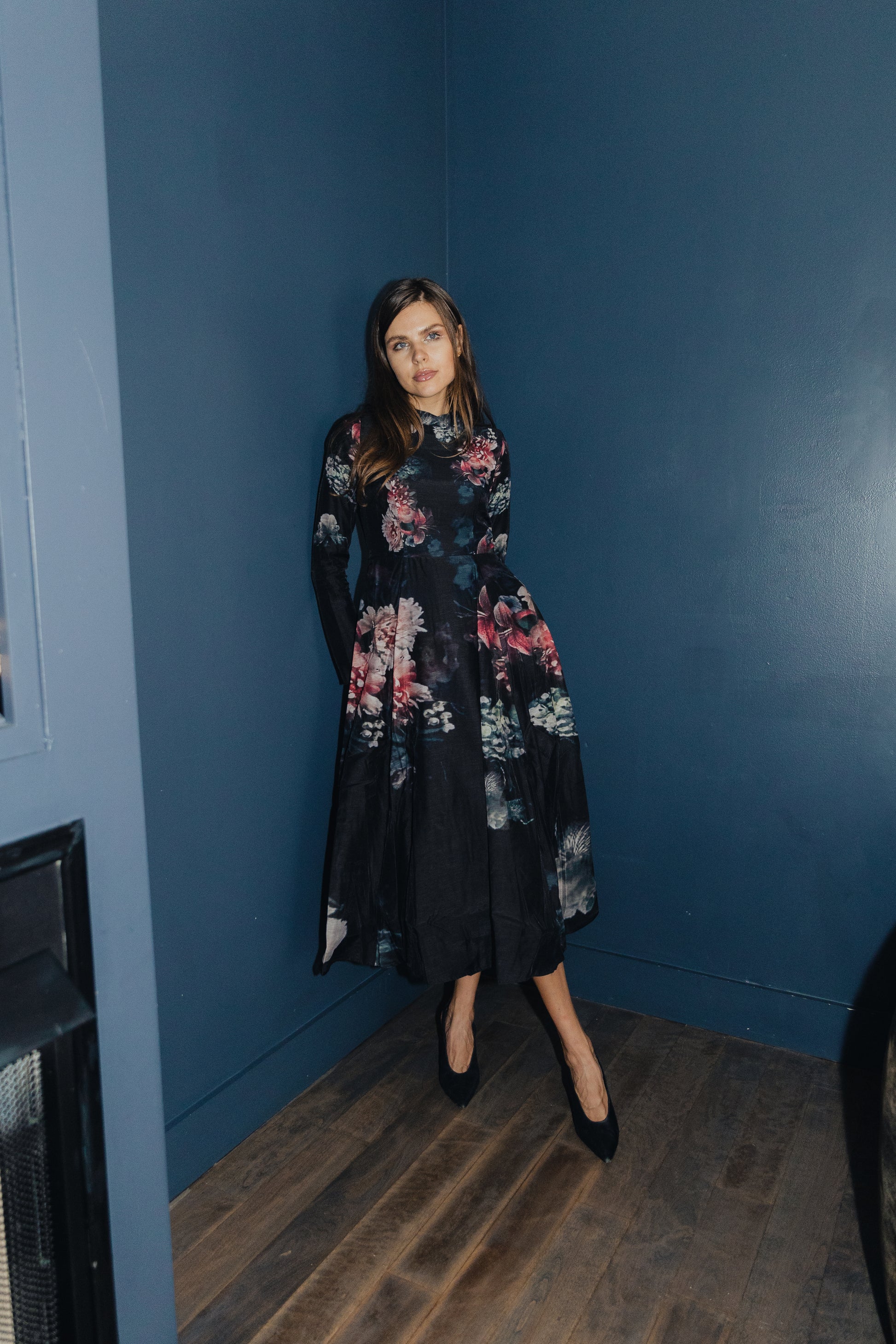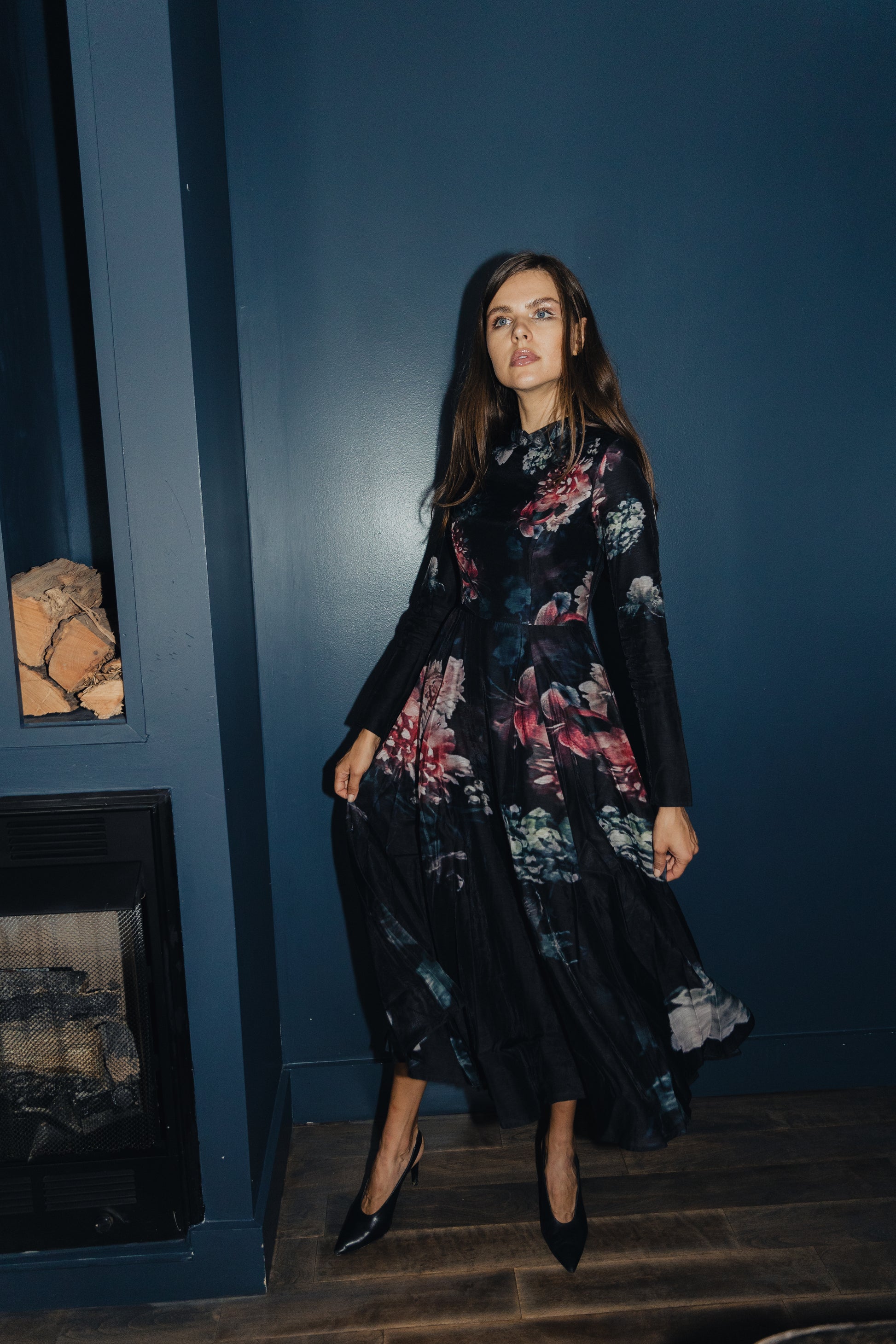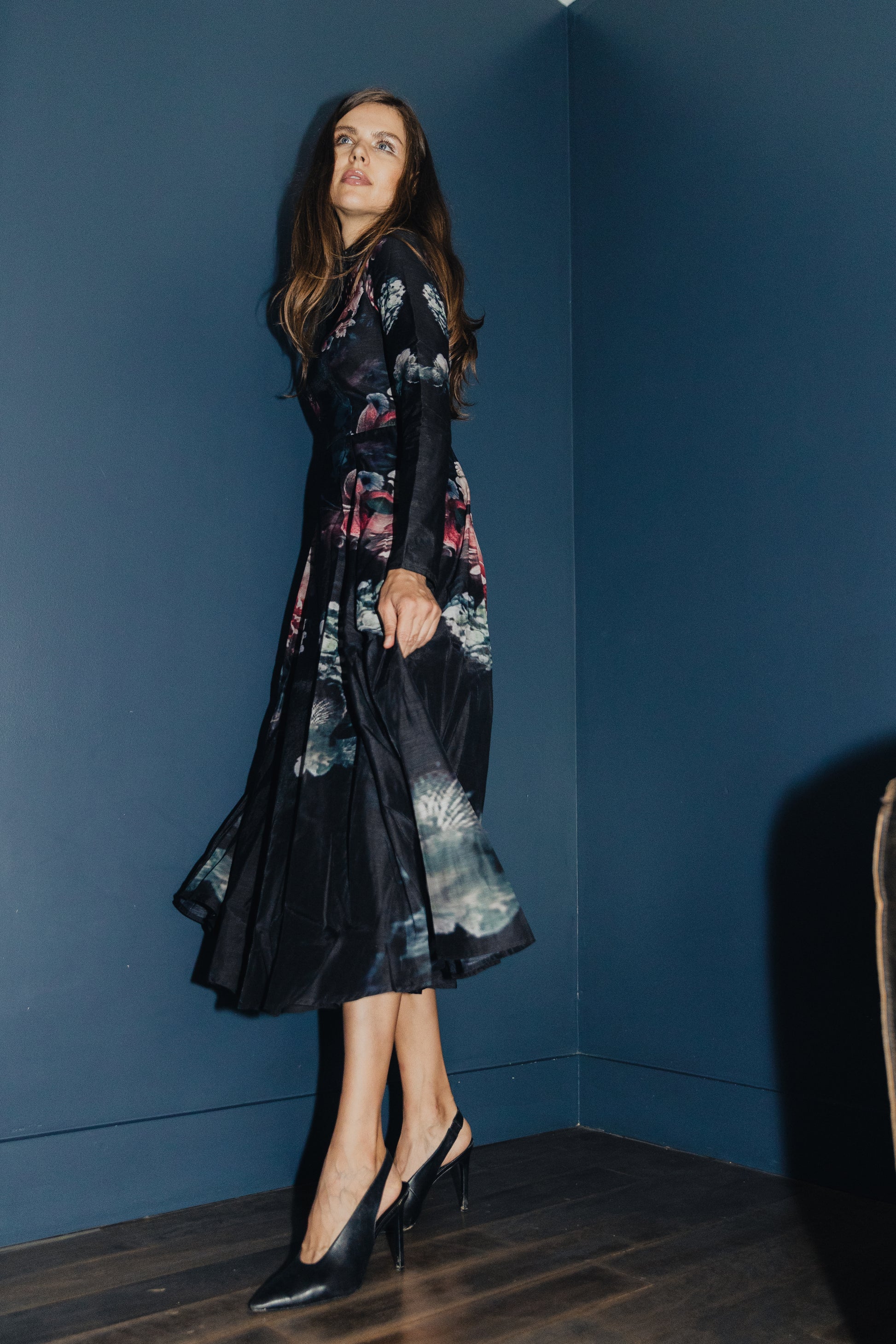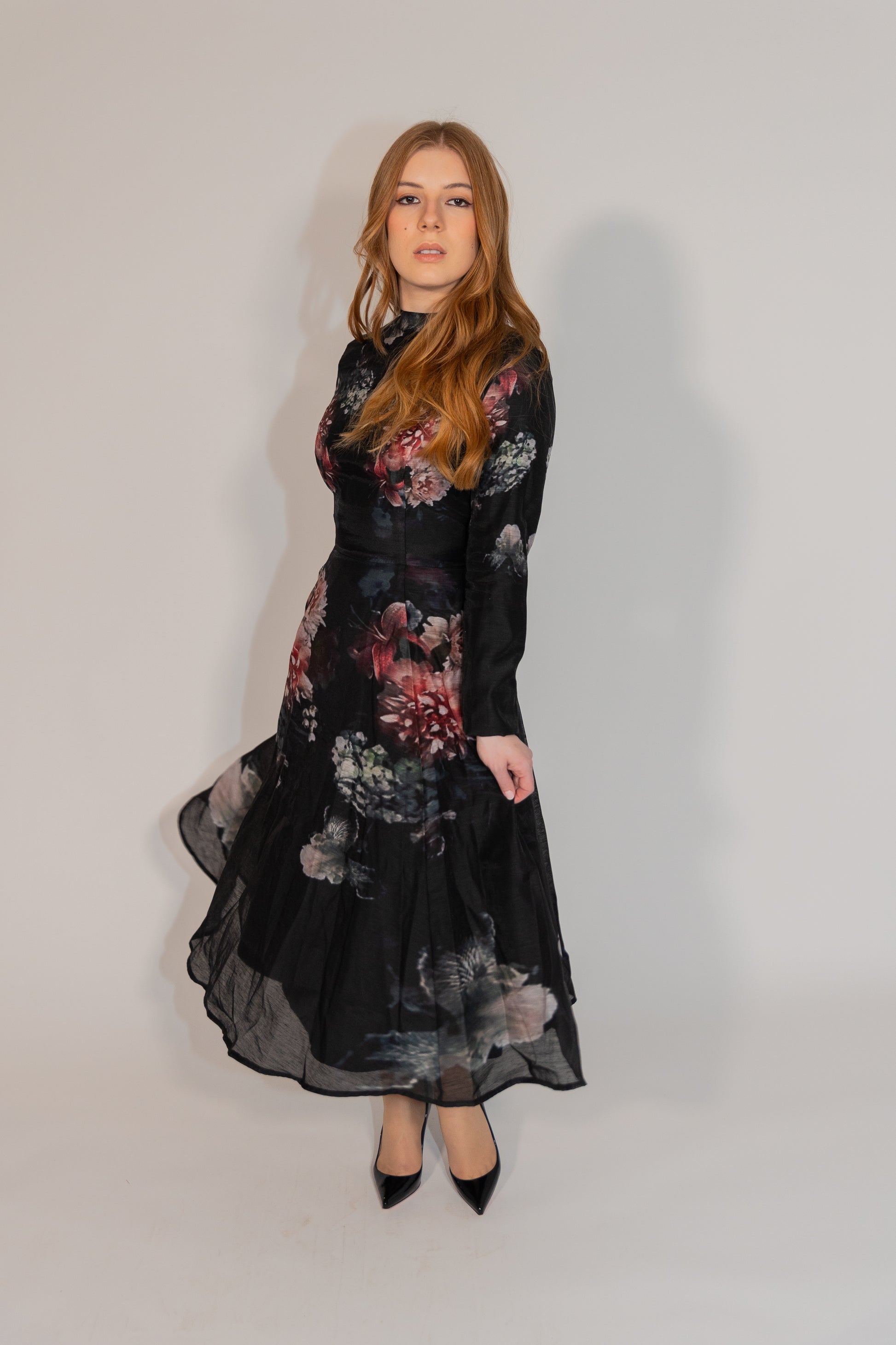 Step into luxury with the Black Iris dress! Made from a premium linen silk mix, this dress features a custom floral print exclusive to the Nina collection. With a high neck, long sleeves, and a flattering princess cut, it's perfect for weddings, bar mitzvahs, or any special event. Get ready to turn heads and feel fabulous in this elegant and sophisticated dress!