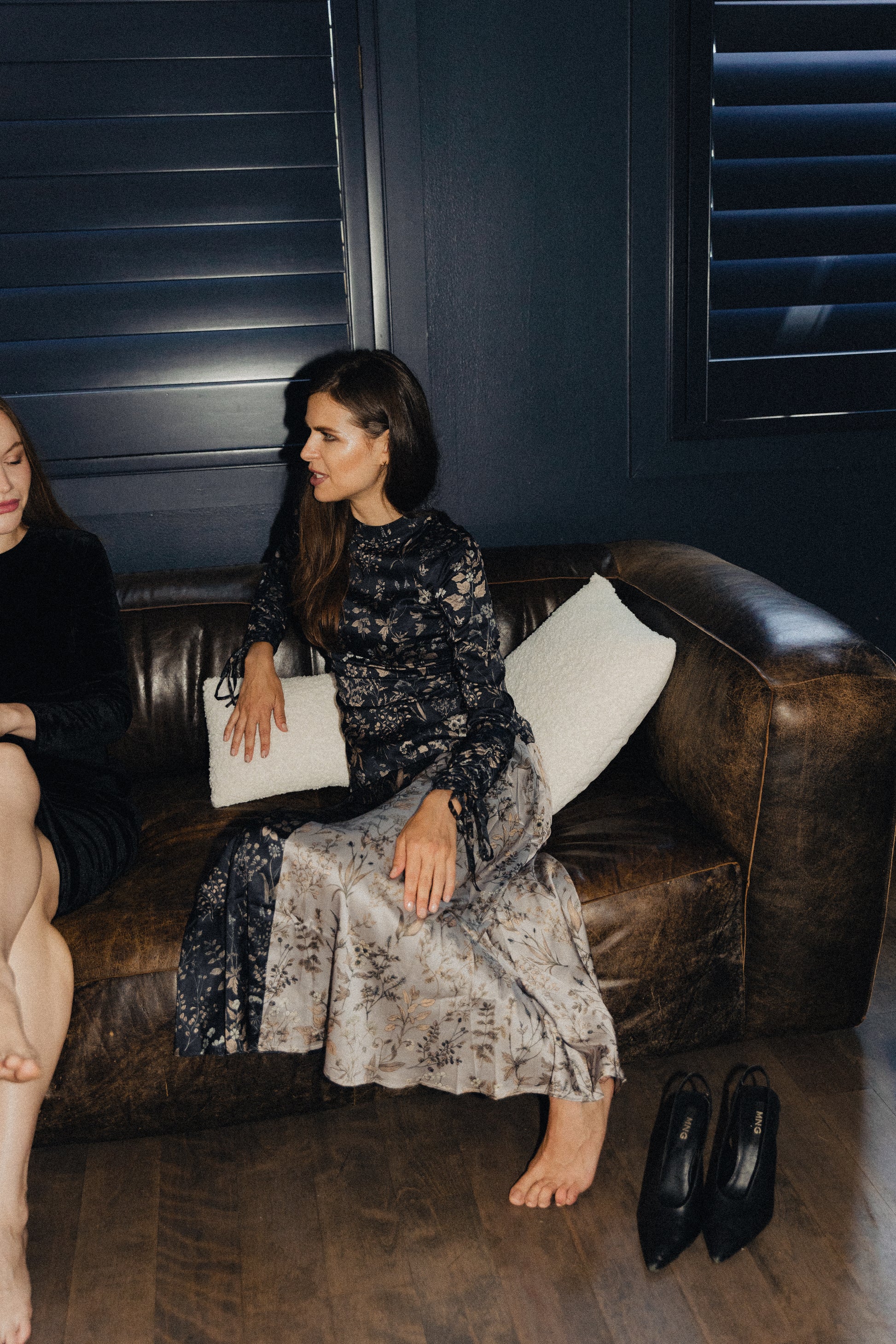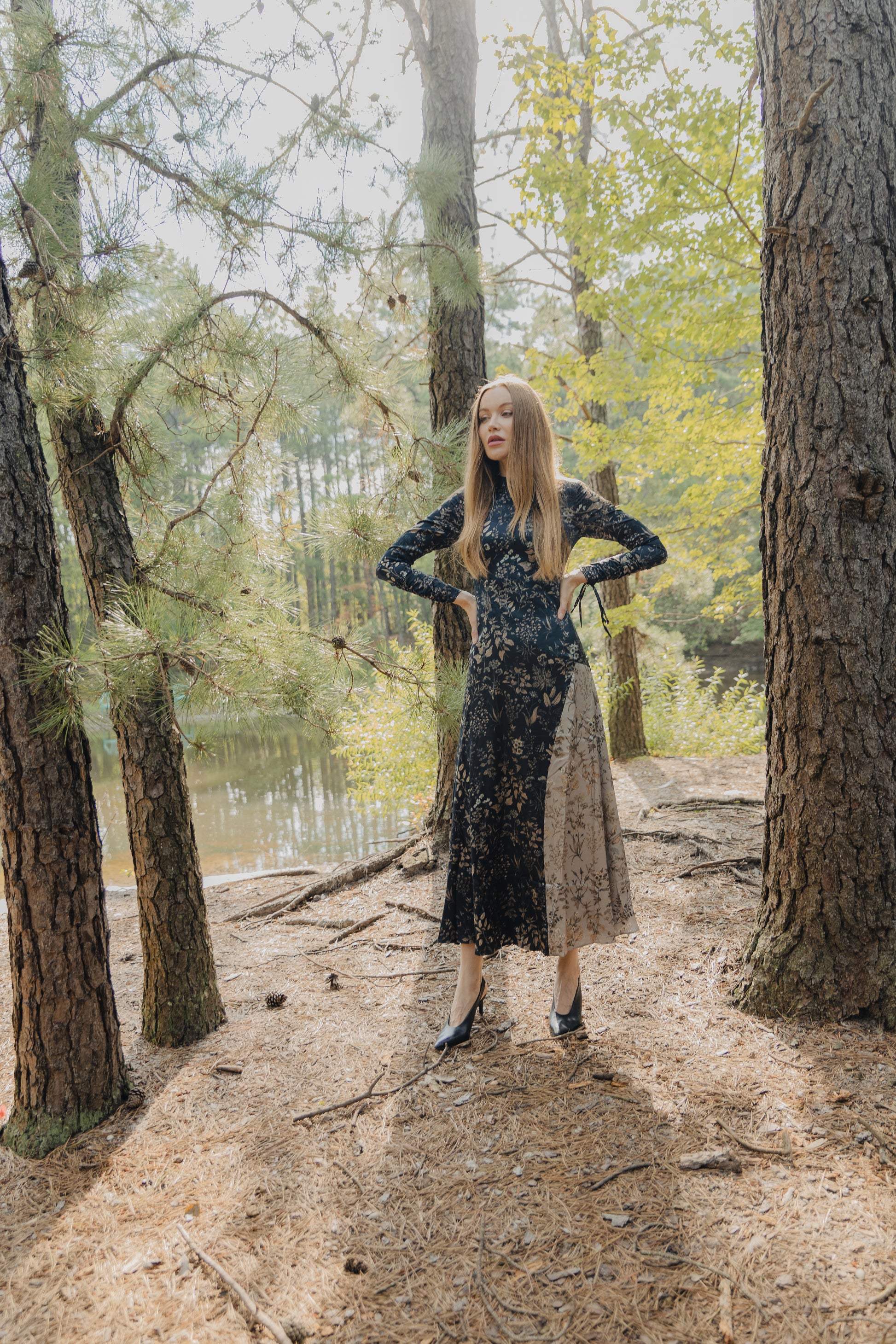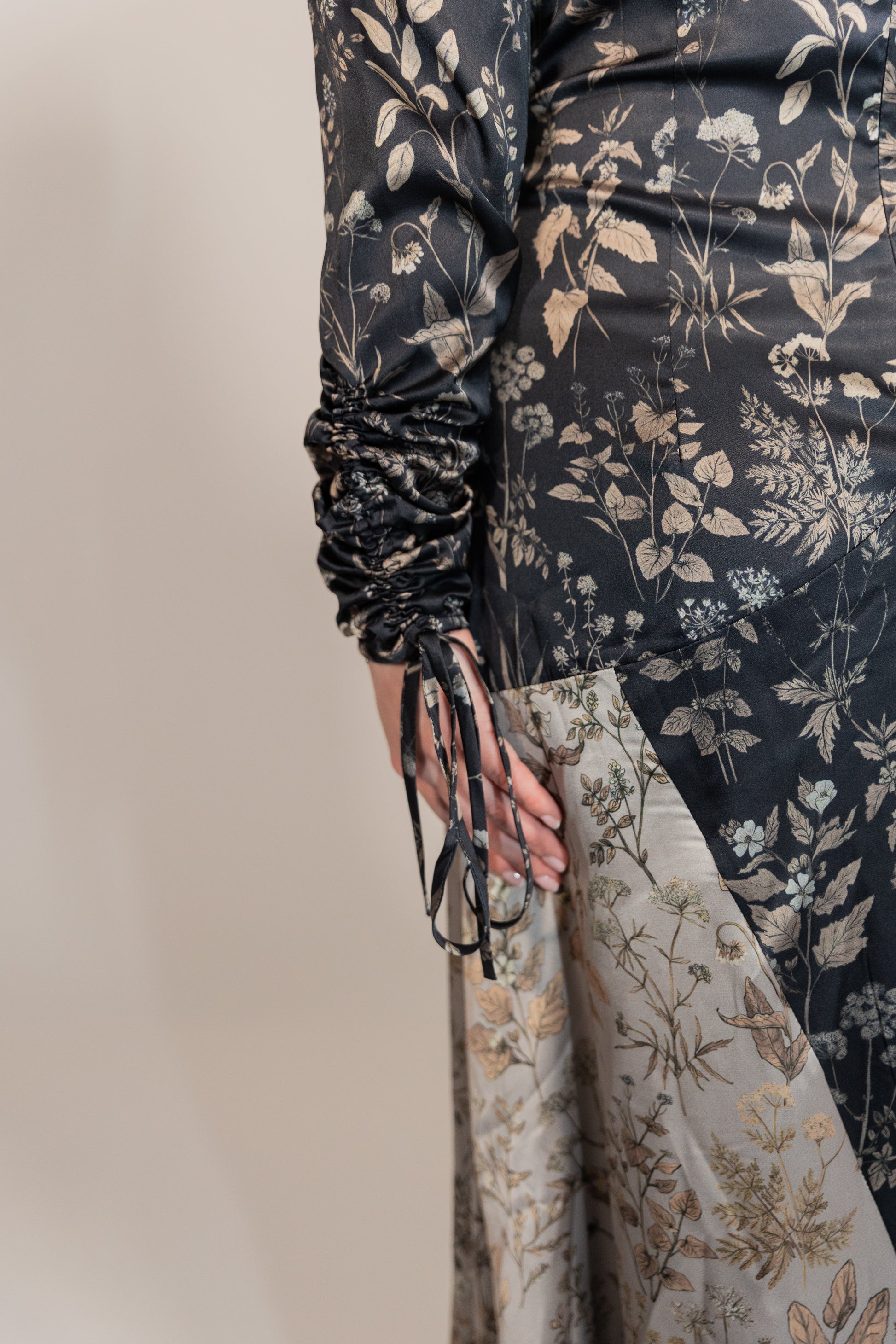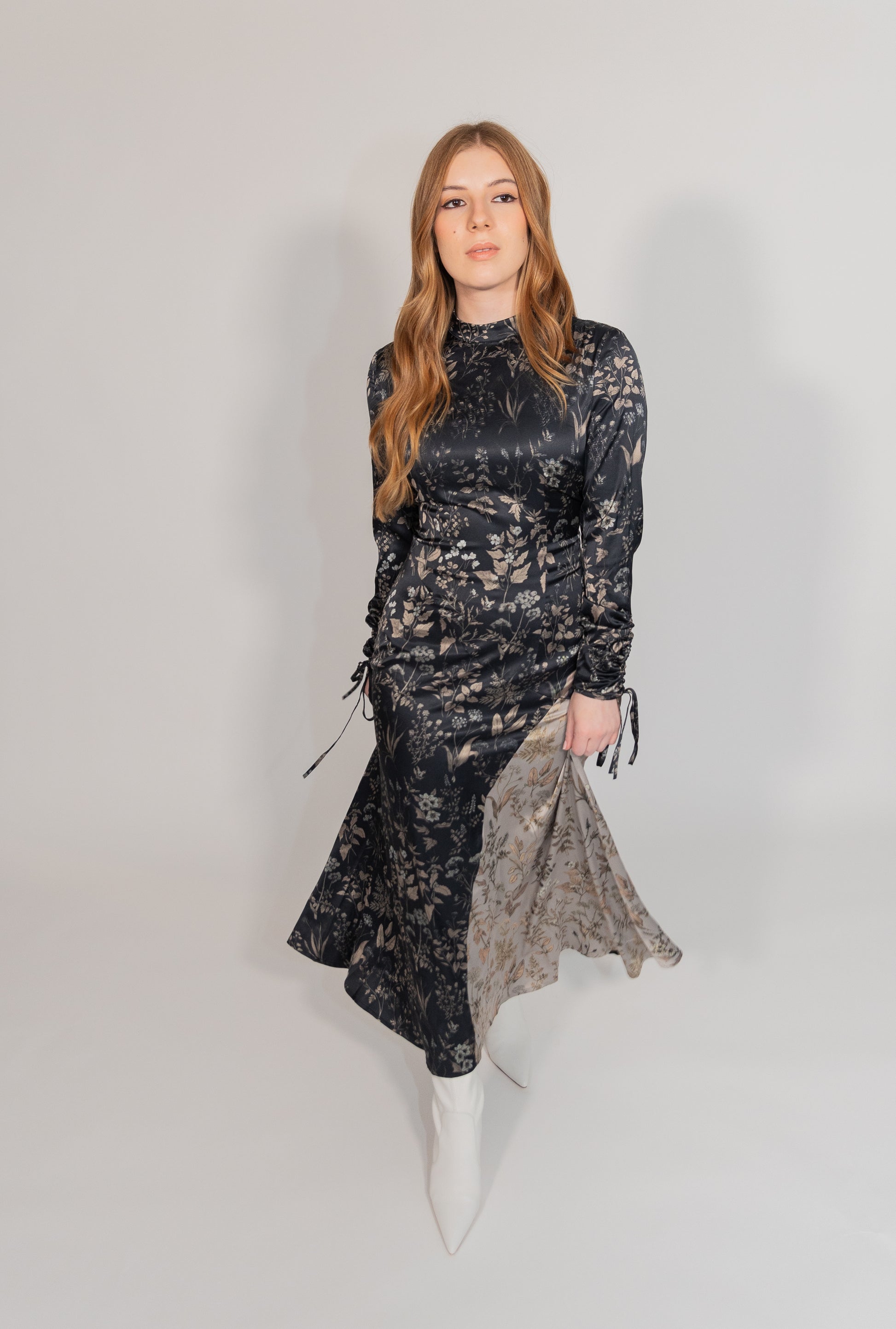 Elevate your wardrobe with our stunning satin custom print dress! This long midi dress boasts a unique colorblocking print on half the skirt, adding a modern twist to a classic silhouette. With a high neck and drawstring sleeves, this dress exudes sophistication and style.