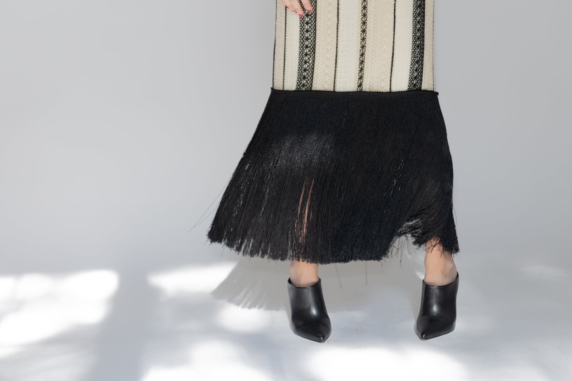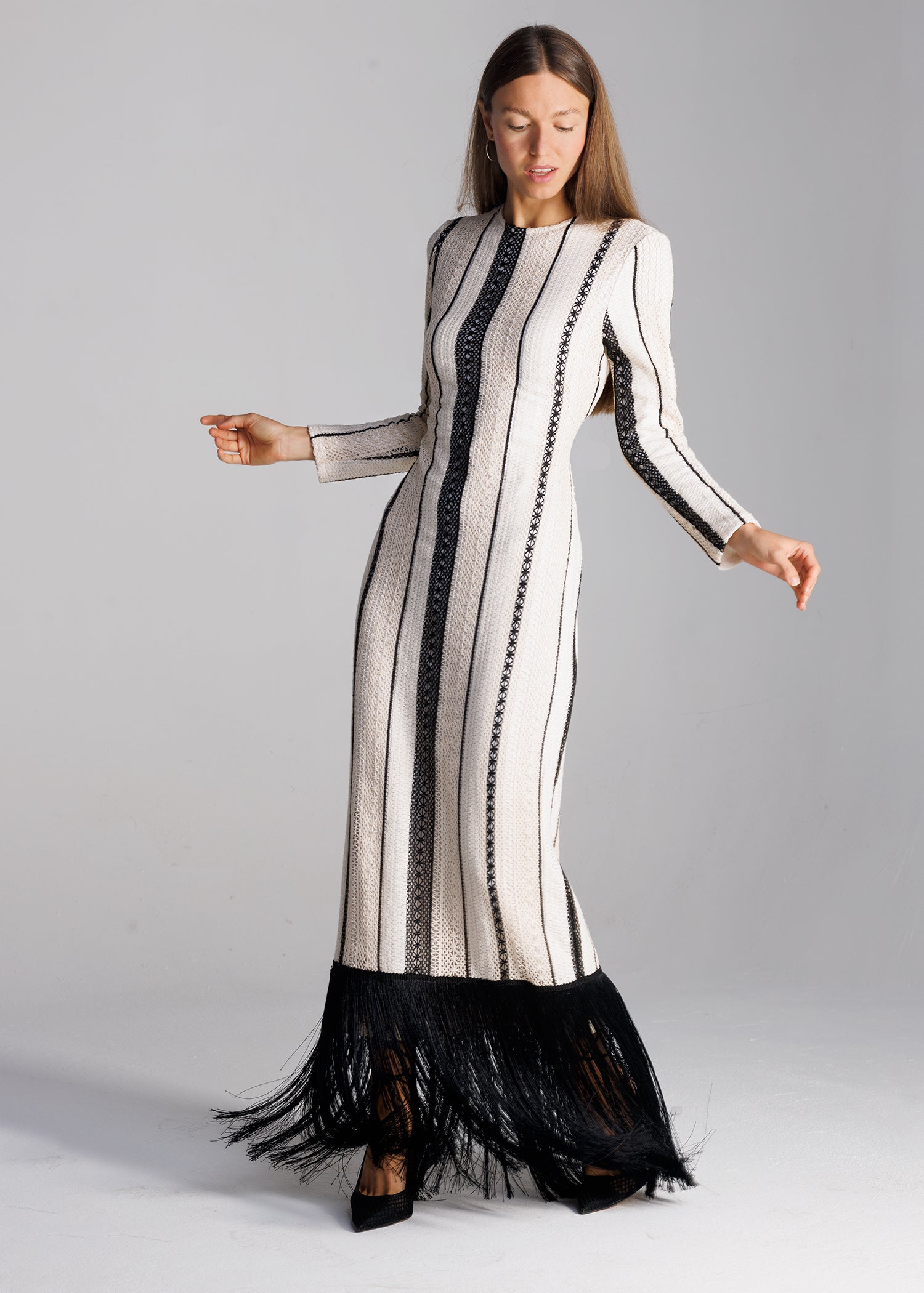 The delicate crochet design adds a touch of femininity to the ensemble, creating an intricate pattern that enhances its timeless appeal. As you move, the fringe hem elegantly sways, creating a mesmerizing dance of textures and movement. Modesty meets chic in this dress, making it the perfect choice for those seeking to make a sophisticated statement at any occasion.