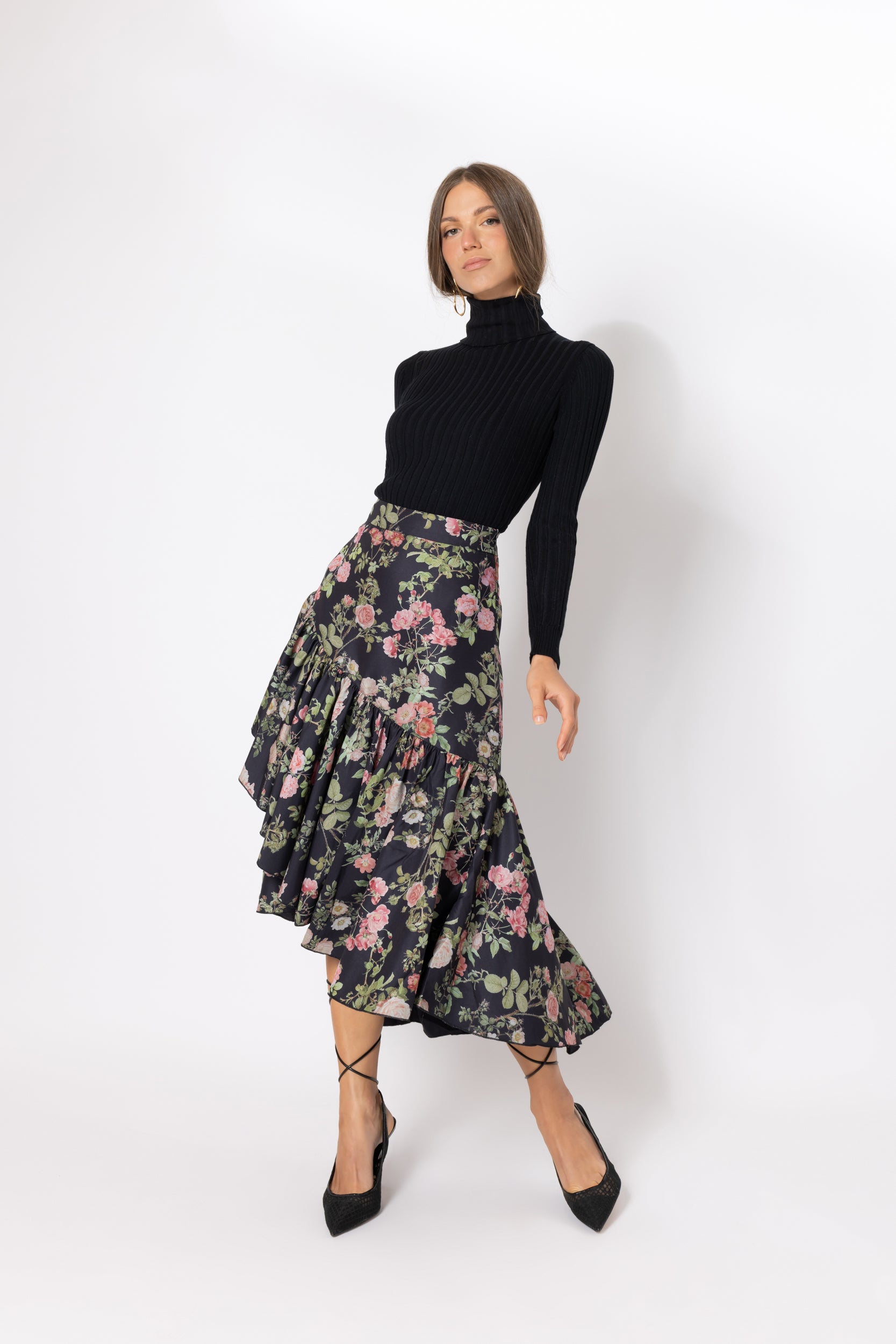 The ELLA skirt its the easiest skirt you'll ever own. black with a delicate pink floral print. Imagine the perfect blend of casual and chic – that's this skirt. With its waist-defining style and cleverly designed low-start ruffle that gracefully sweeps from hip to back, it's all the elegance without any bulk. The black backdrop adorned with delicate pink florals brings a pop of color to your look, and the midi high-low cut adds a touch of playful sophistication. Whether you're brunching with friends or dressing it up for a night out, this skirt effortlessly levels up your style game. Don't miss out – your closet deserves this versatile gem.