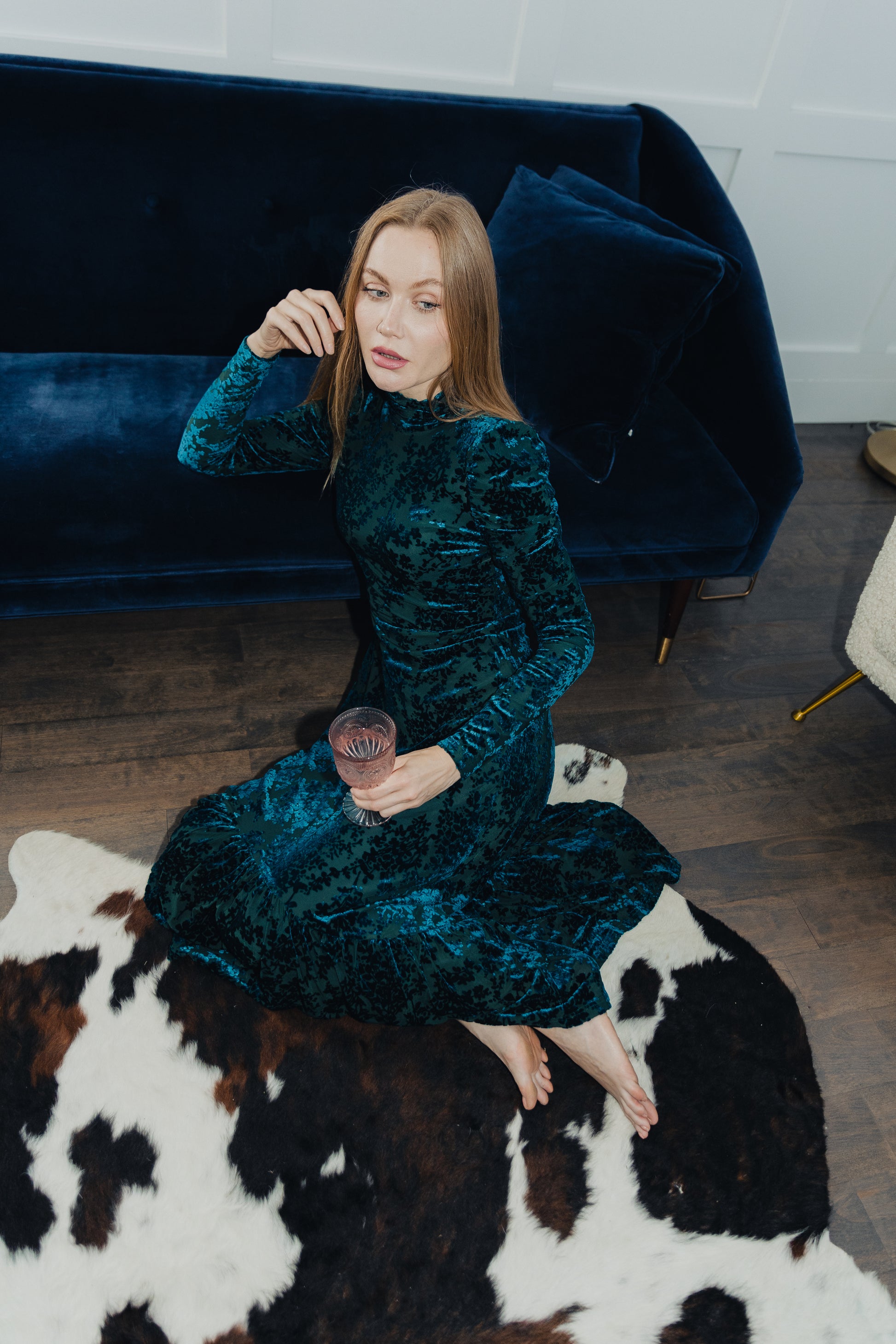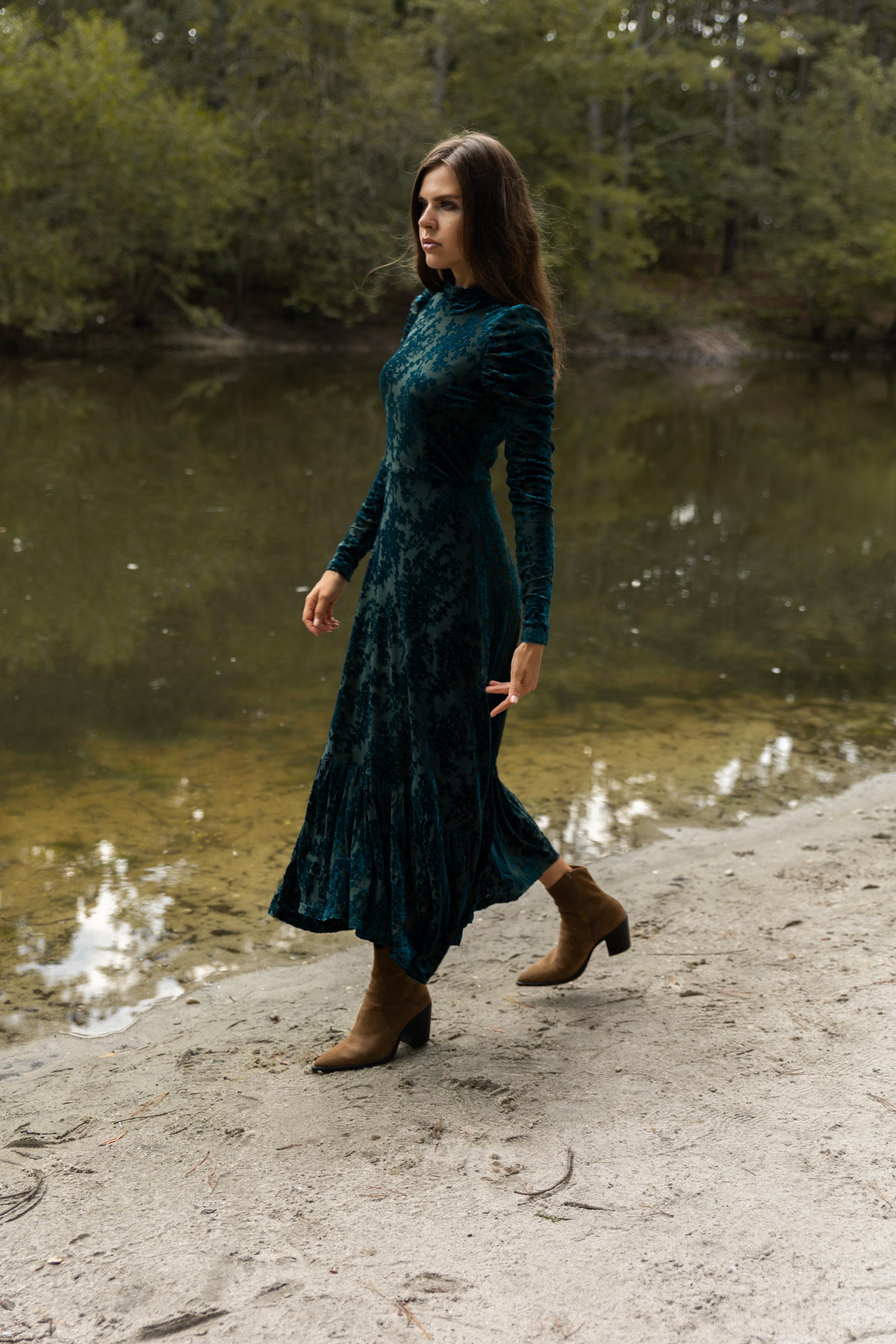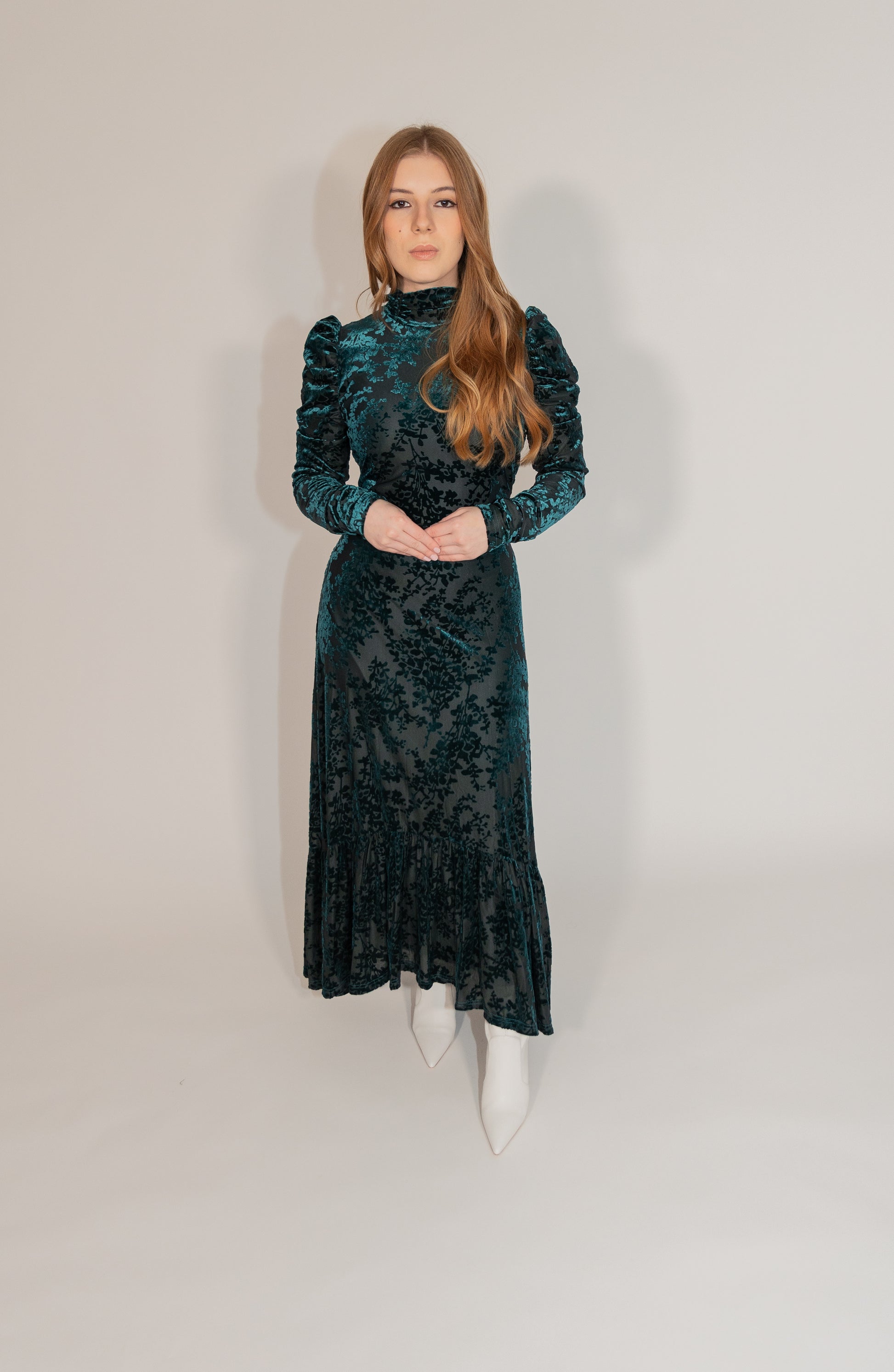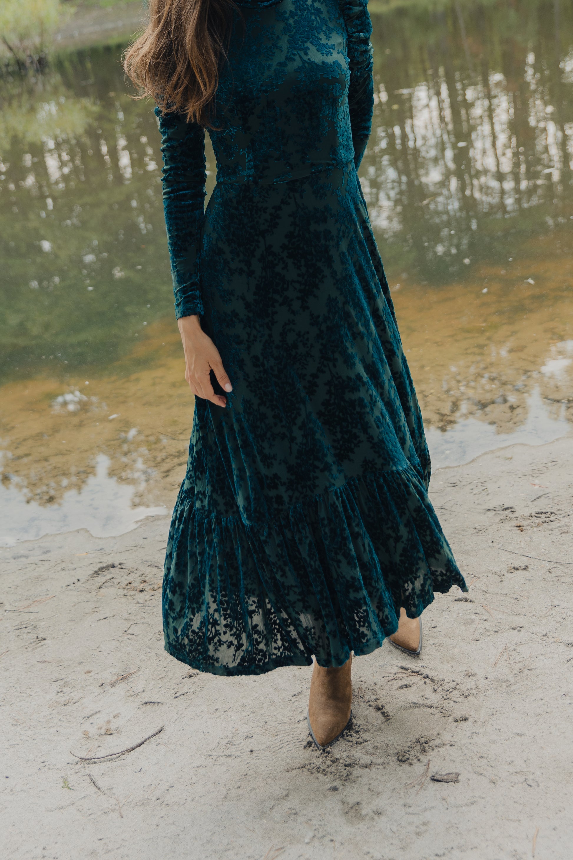 Discover the epitome of sophistication with our Teal Floral Mesh Dress, a luxurious creation crafted from rich teal burnout velvet. Featuring a high neck and meticulously ruched details, this dress exudes refined elegance. The fitted long sleeves with delicate draped accents on the shoulders and the high-low tier at the hem create a dynamic and graceful silhouette. Designed for comfort, this dress is perfect for glamorous parties, Friday dinners, or as a wedding guest outfit. Embrace the unparalleled elegance and make a grand entrance at any event with our Teal Floral Mesh Dress, the ultimate statement piece for any special occasion. Shop now and elevate your wardrobe with this sophisticated and stylish dress.
