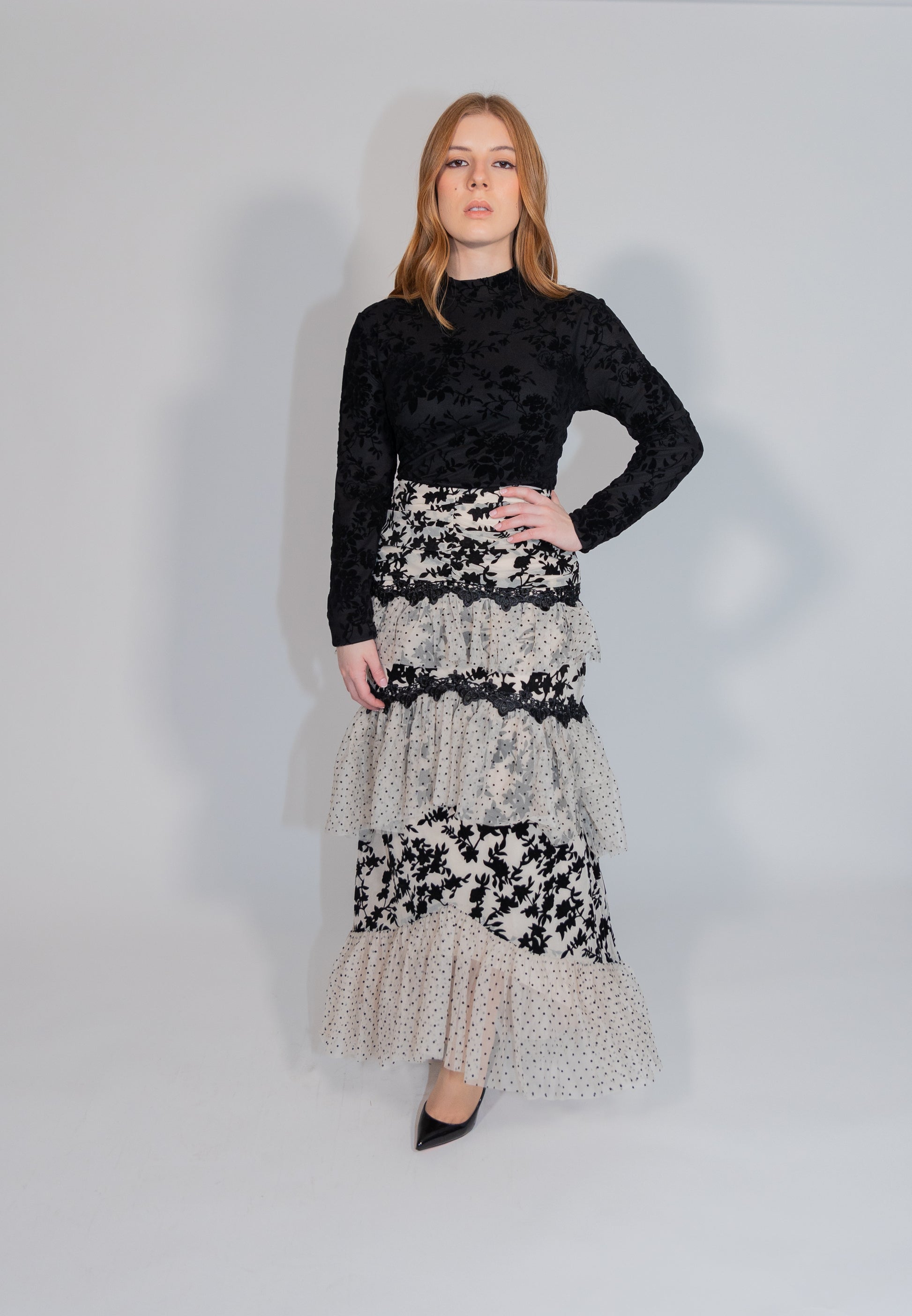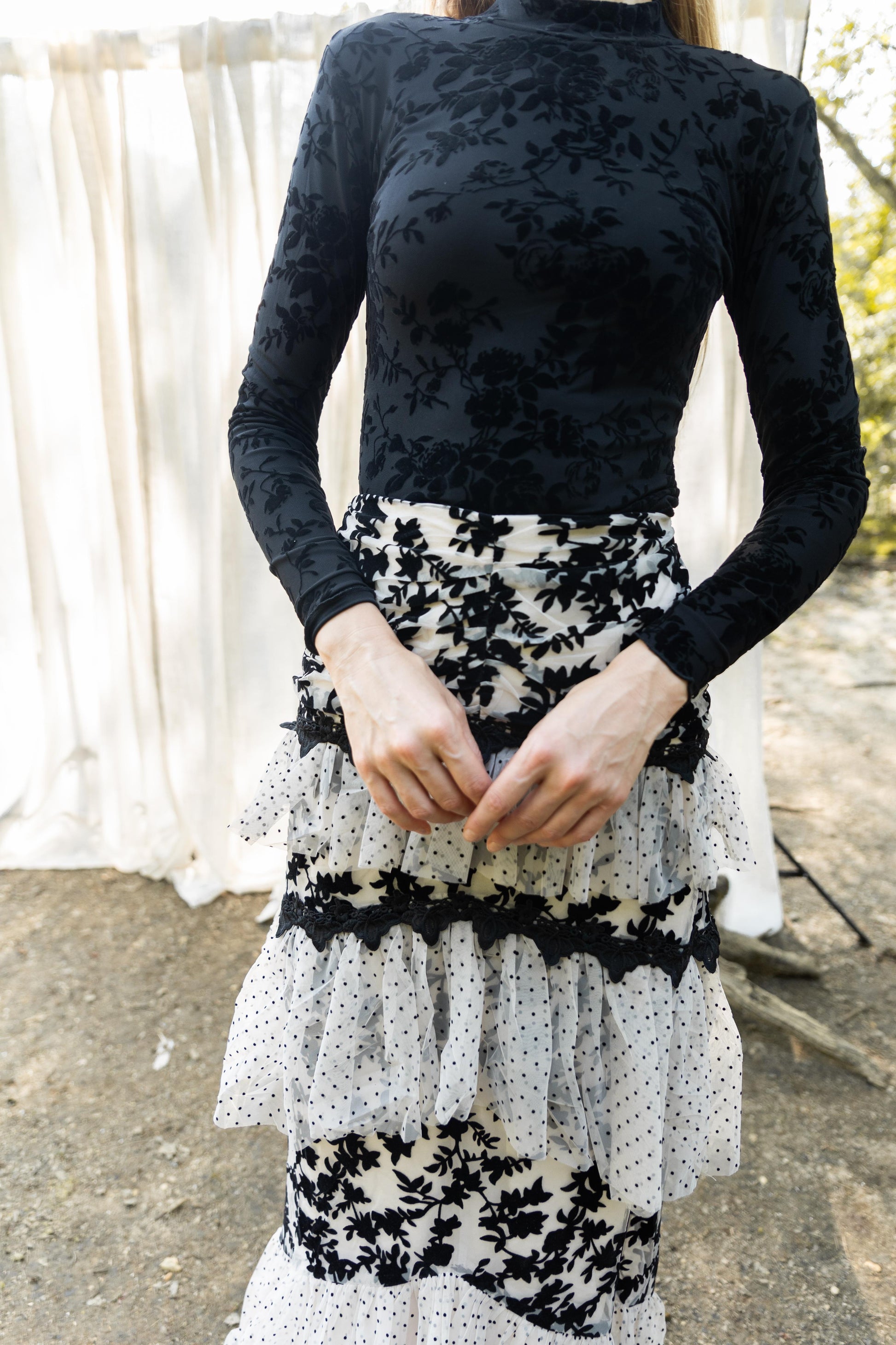 Elevate your style with our Floral Mesh Top, featuring a sophisticated high neck and stunning floral velvet burnout print. Designed for an incredible fit that flatters your silhouette, this black dressy top pairs effortlessly with any skirt and looks exceptionally chic with our Flora Skirt. Perfect for elegant dinners, upscale events, or adding a touch of luxury to your everyday wear, the Floral Mesh Top combines comfort and high fashion seamlessly. Shop now to add this versatile and stylish piece to your wardrobe, ensuring you turn heads at every occasion.