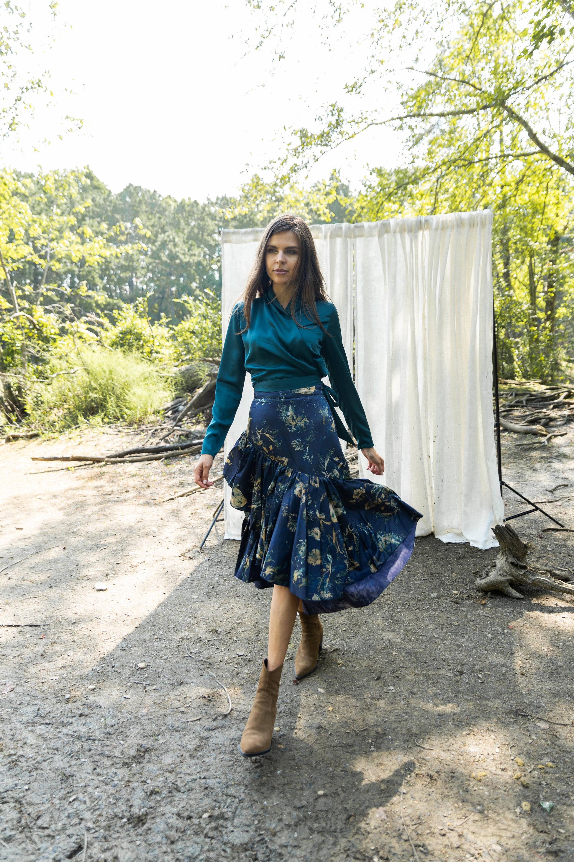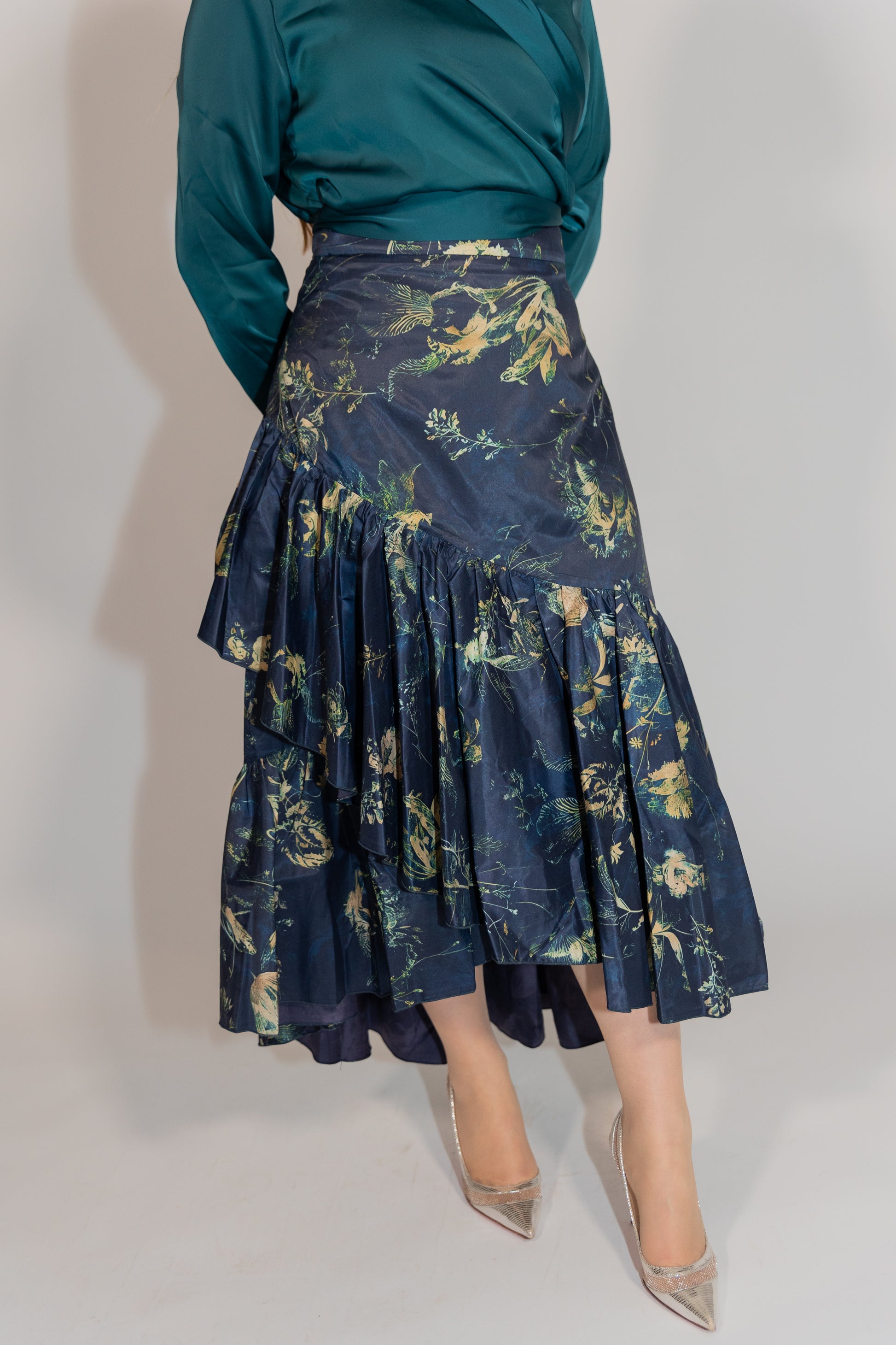 Discover the exquisite Nina Skirt, a masterful creation that combines luxury with exceptional design. This stunning skirt features an intricate navy and gold floral print that exudes sophistication and charm. Its high-low midi length showcases a cascade of large ruffles starting at the mid-hip, strategically placed to enhance your figure while providing a flattering silhouette. The skirt is impeccably waisted with darts, ensuring an amazing fit that accentuates your waistline without adding bulk. Perfectly versatile, the Nina Skirt pairs beautifully with tops in navy, green, or gold, but can effortlessly complement any ensemble. Elevate your wardrobe with this extraordinary skirt, designed to offer both elegance and comfort for any special occasion. Shop now to experience the ultimate in refined fashion and style.