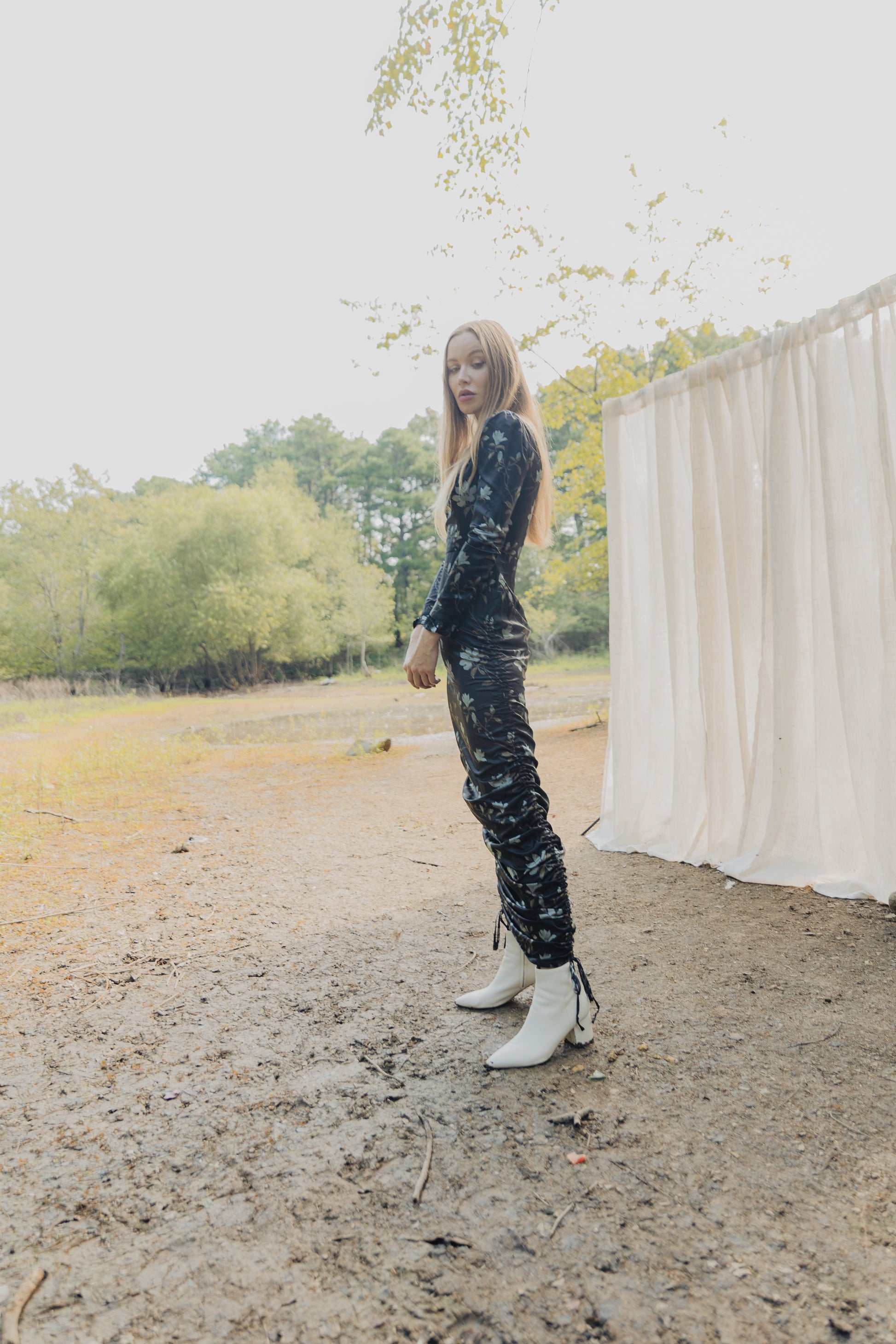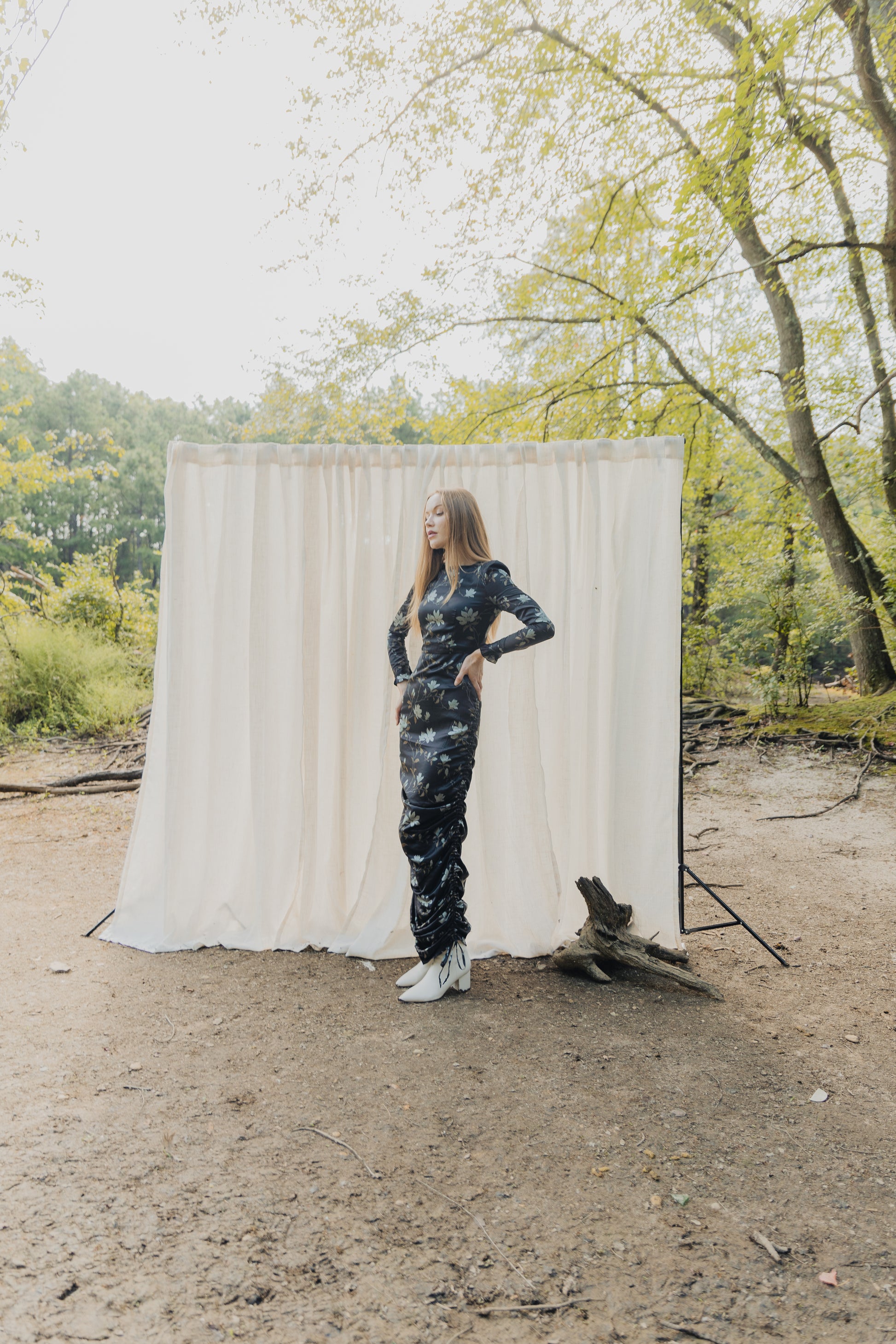 The Nina Dress is a stunning blend of elegance and versatility. Crafted in a deep, classic black, this long dress features a beautiful ivory floral print that adds a touch of refined charm. Its adjustable drawstrings along the skirt allow you to customize the length, creating a look that can transition seamlessly from day to night. The puffed shoulders and buttoned cuffs of the sleeves lend a sophisticated, vintage-inspired flair. Perfect for any occasion, the Nina Dress combines timeless style with modern functionality.