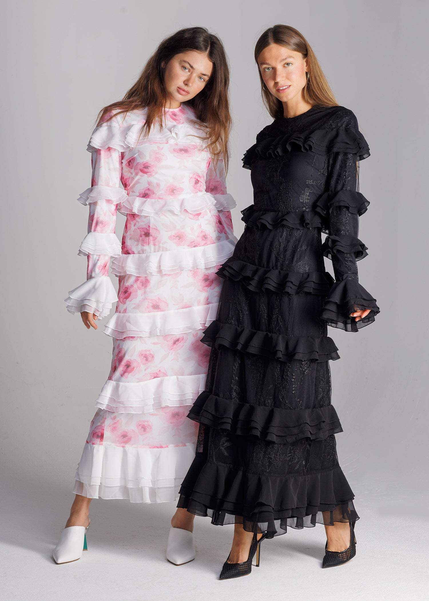 The princess cut beneath the cascading ruffles ensures an impeccable fit, embracing your silhouette with structured elegance. Both options, whether the gentle allure of the pink rose print or the rich and luxurious black lace with delicate embroidered florals, promise an experience of unparalleled softness and comfort. To add a touch of versatility, the gown features an optional bell sleeve, effortlessly removable with hidden snaps.