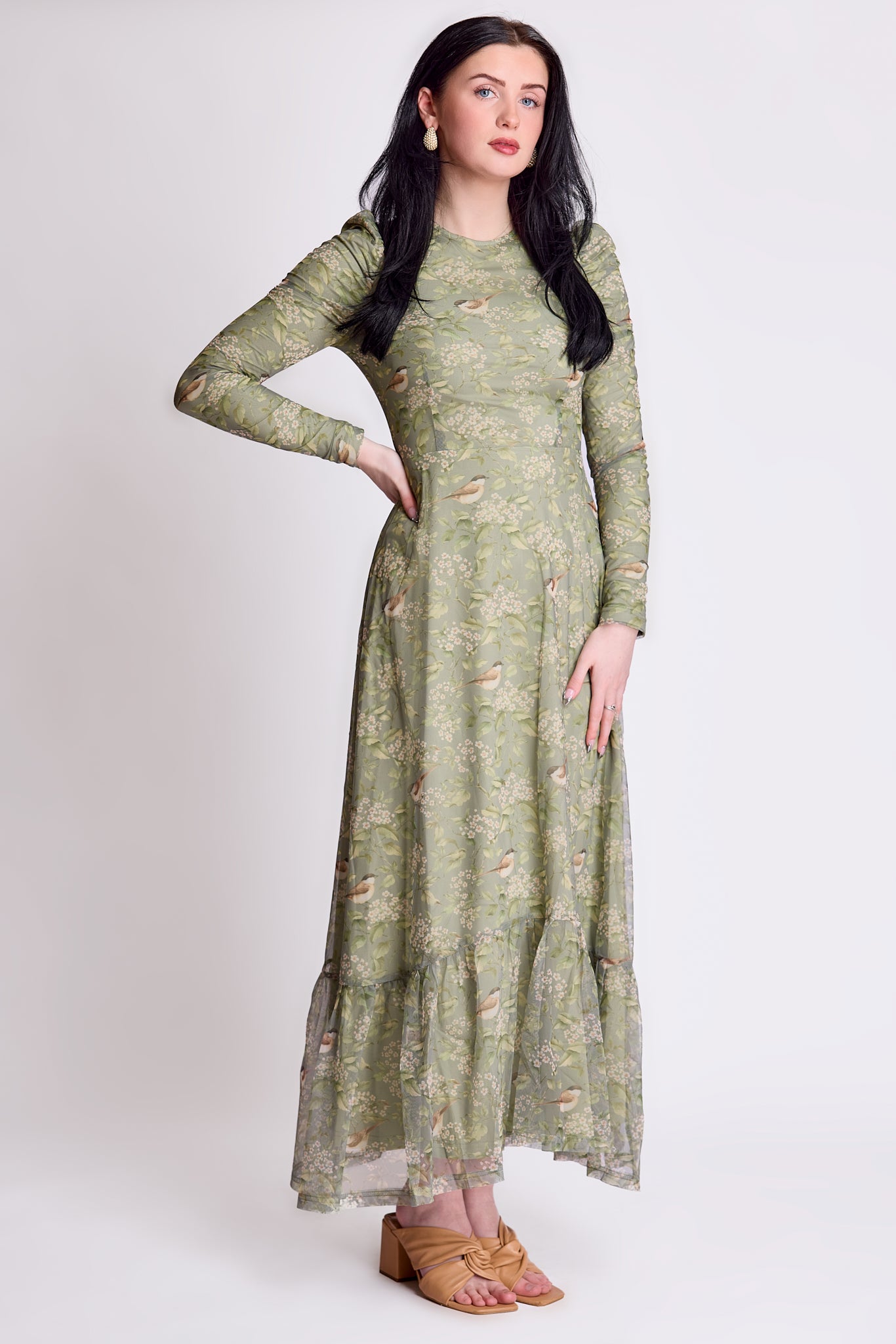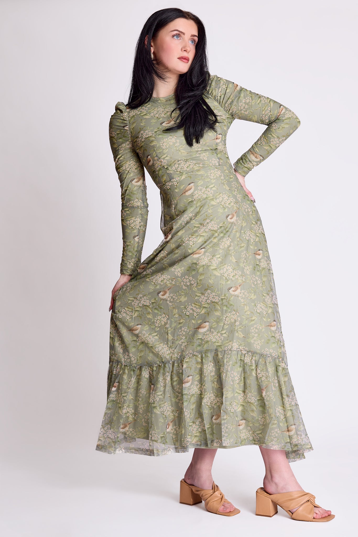 Experience the enchantment of a garden party with our limited edition Summer Garden Sage Dress. Featuring a beautiful printed mesh adorned with whimsical garden illustrations. The gathered sleeves, defined waist, and asymmetrical ruffle hem add a touch of elegance to this unique piece. Perfect for any formal or semi-formal occasion.