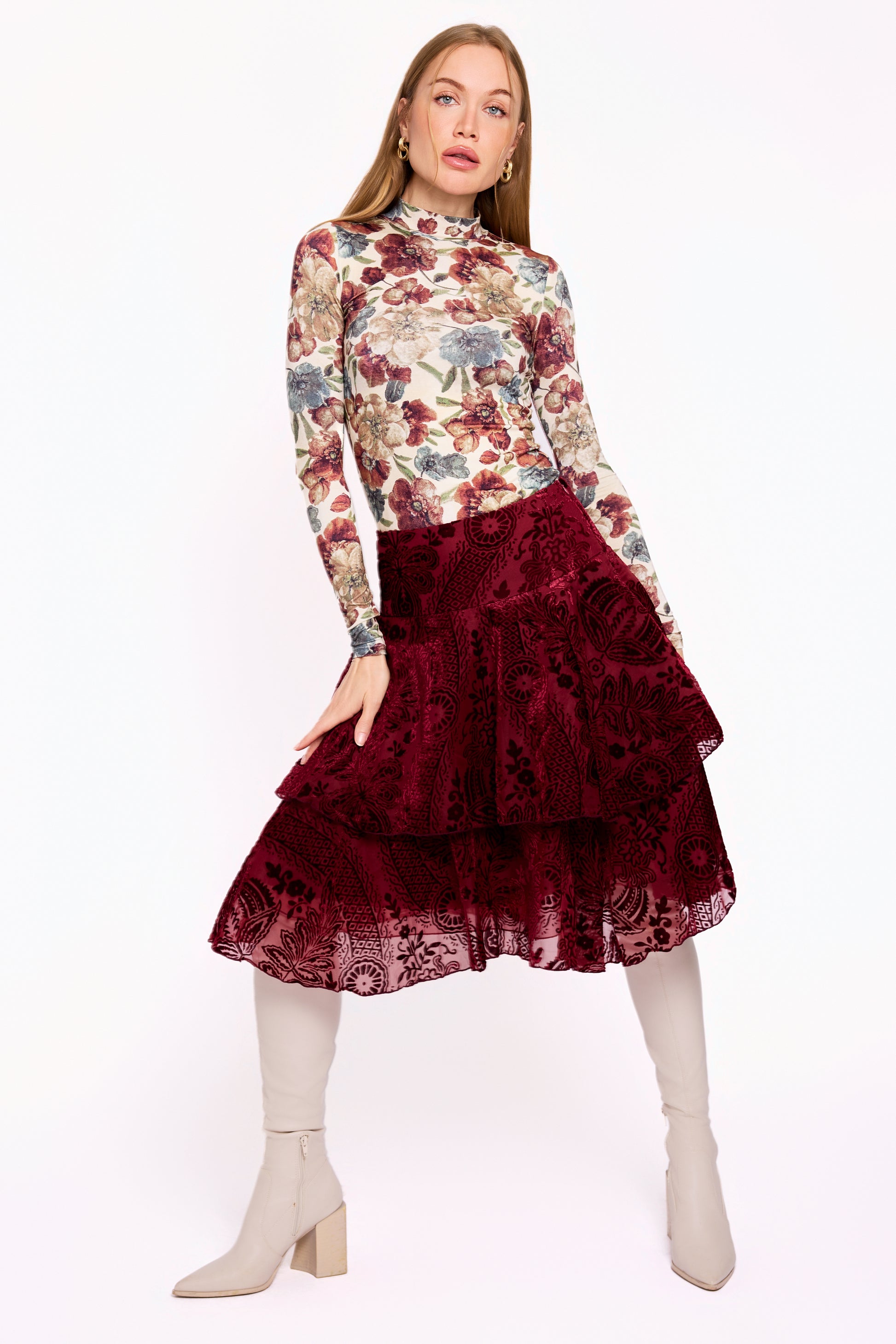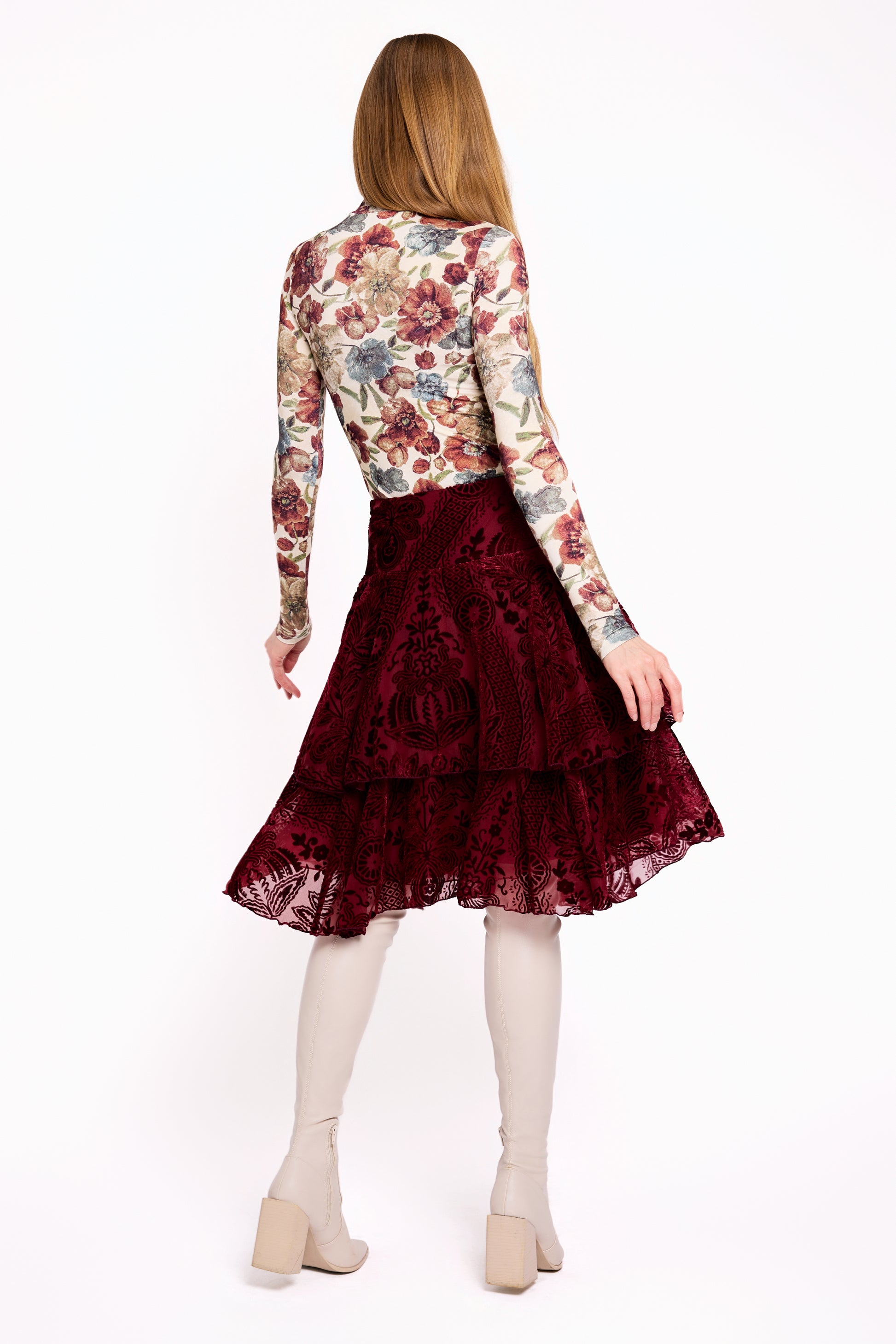 The Alice Skirt captures timeless femininity with a regal twist. Made from luxurious wine-colored burnout velvet, it features an ornate French-inspired pattern that brings depth, texture, and vintage elegance to the forefront. The wide waistband defines the figure beautifully, while two layered ruffles create graceful movement and a softly structured shape.