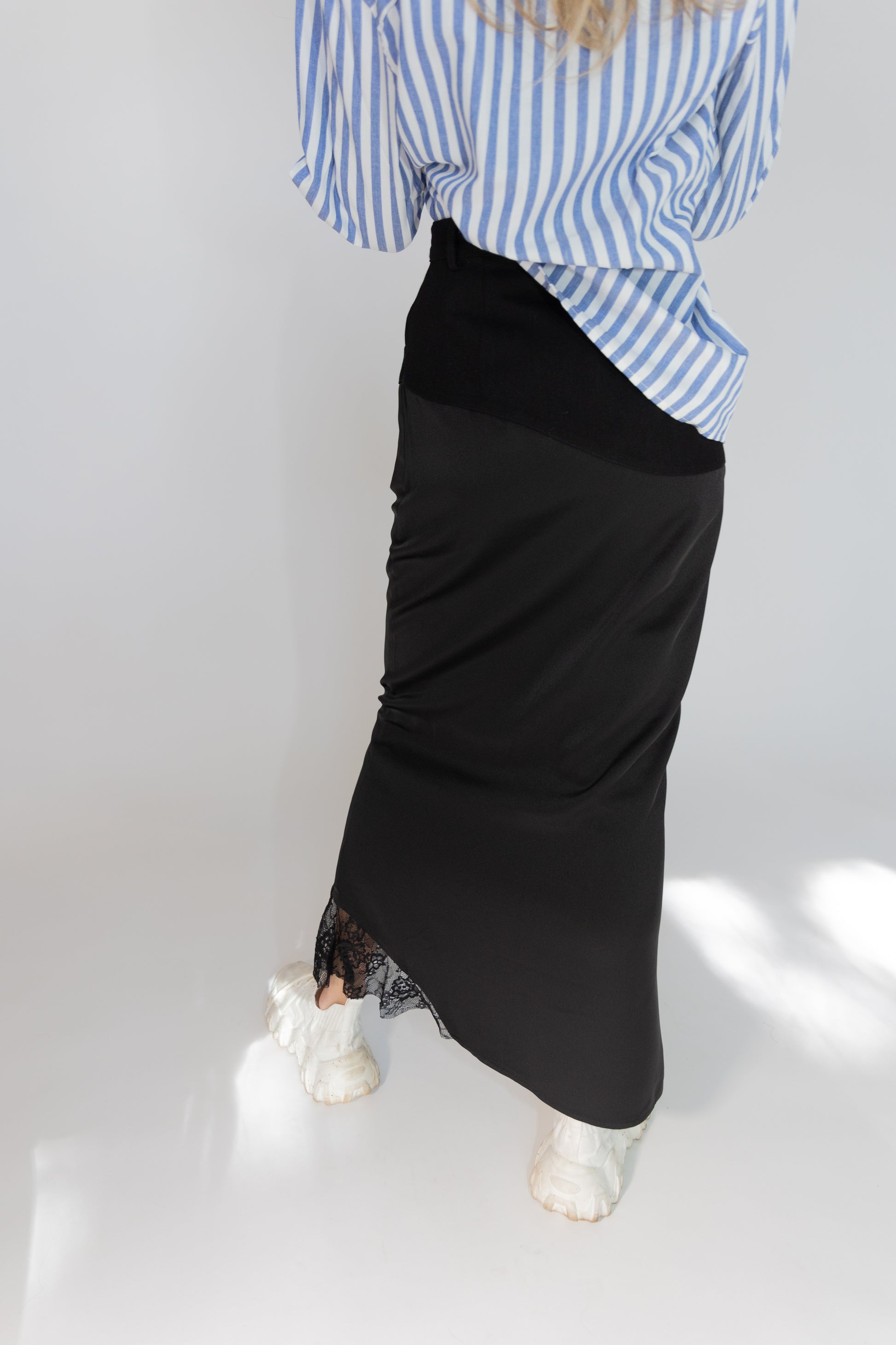 Step into a world where timeless classics are redefined. The Reimagined Skirt seamlessly blends the familiar elements of your favorite styles – denim, satin, and lace – into a harmonious masterpiece. Crafted with meticulous attention to detail, this skirt embodies the essence of modern fashion. At the top, indulge in the beloved cut and fit of your favorite denim skirt, seamlessly transitioning into a flowy satin fabric with a delicate lace detail peeking out from the bottom left corner, adding a touch of romance to every step you take.