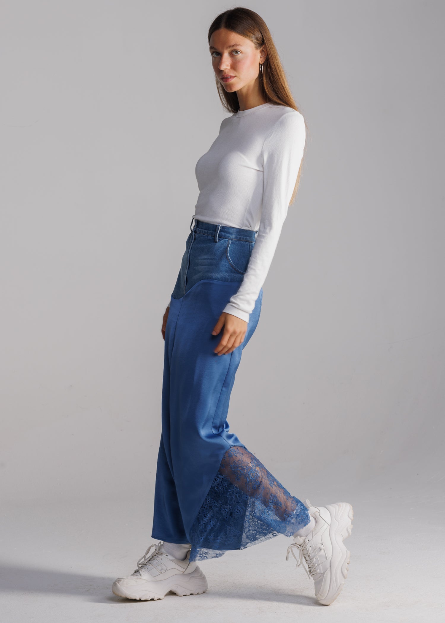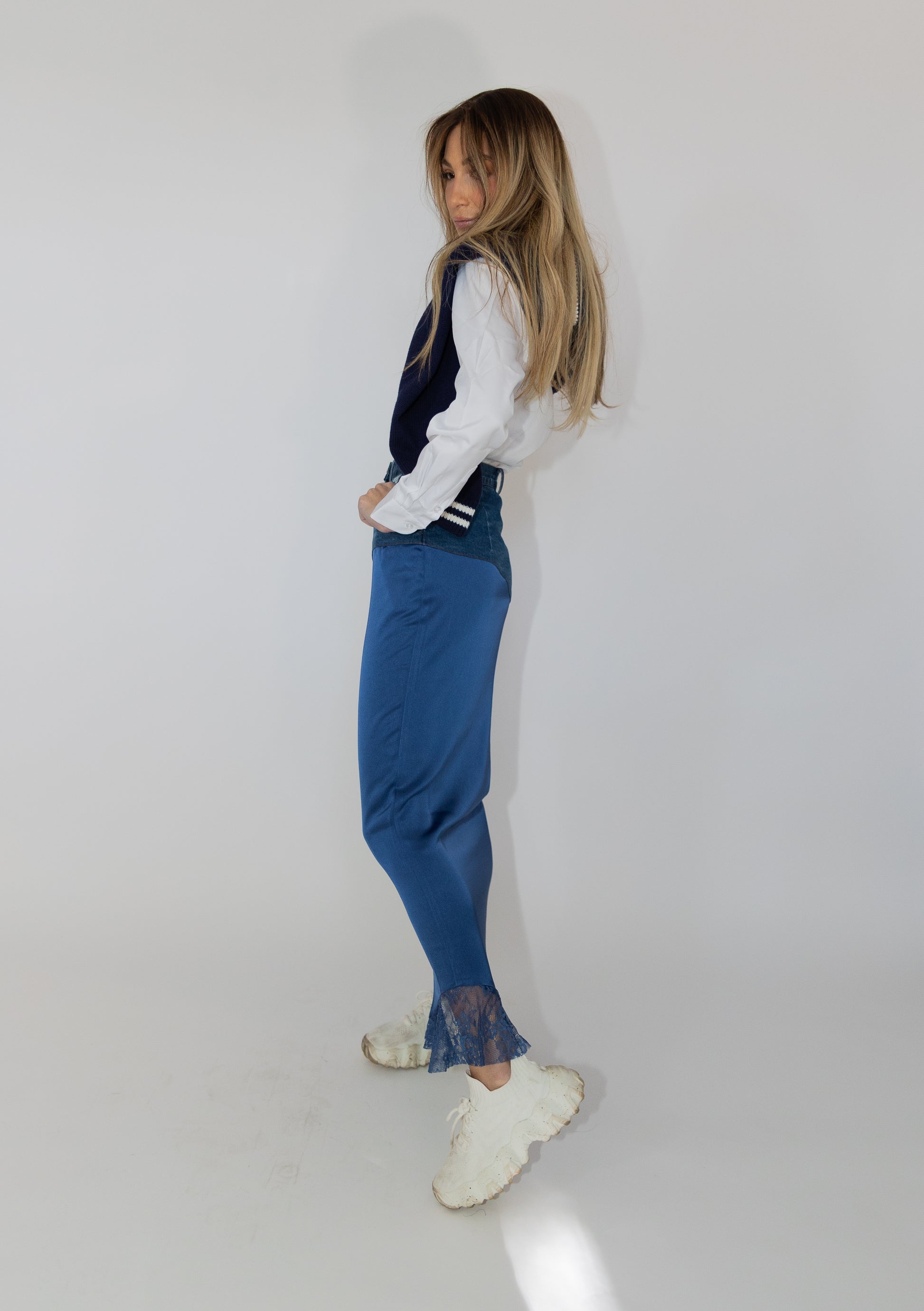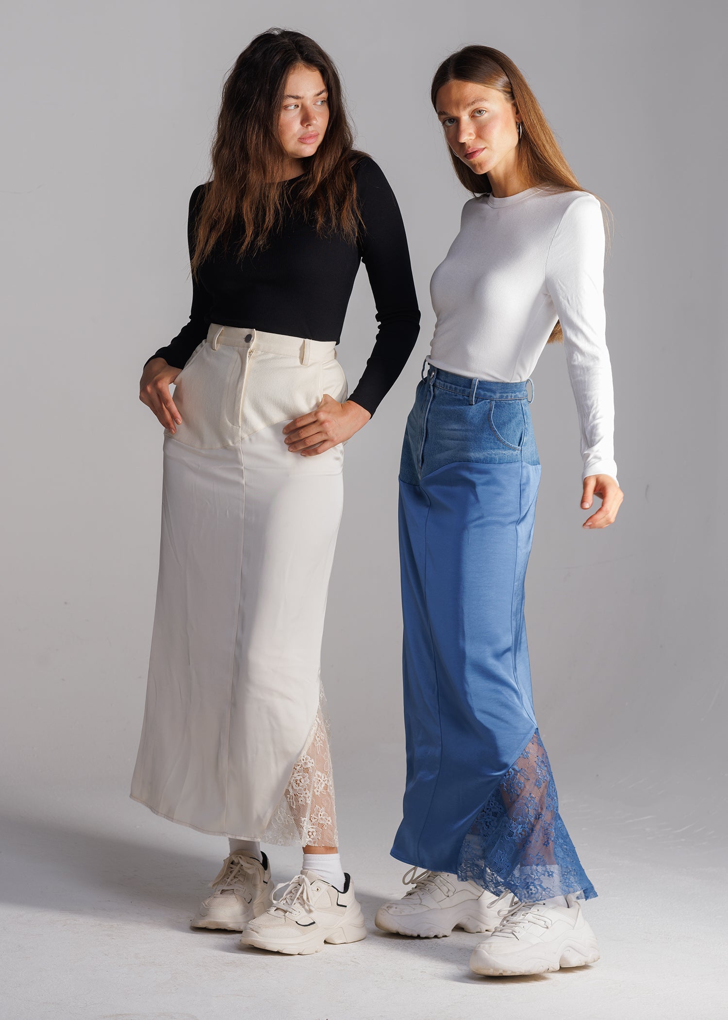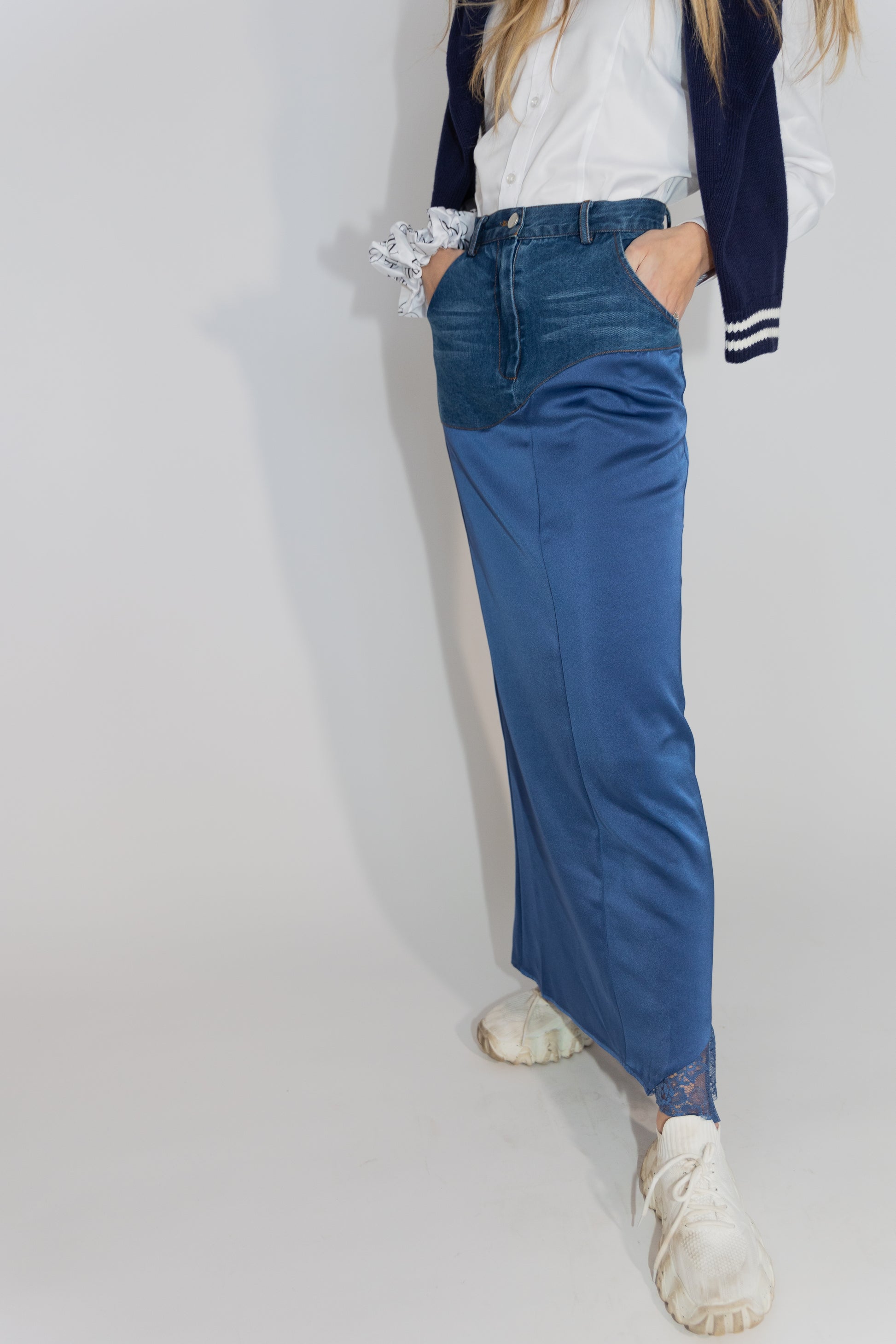 Step into a world where timeless classics are redefined. The Reimagined Skirt seamlessly blends the familiar elements of your favorite styles – denim, satin, and lace – into a harmonious masterpiece. Crafted with meticulous attention to detail, this skirt embodies the essence of modern fashion. At the top, indulge in the beloved cut and fit of your favorite denim skirt, seamlessly transitioning into a flowy satin fabric with a delicate lace detail peeking out from the bottom left corner, adding a touch of romance to every step you take.