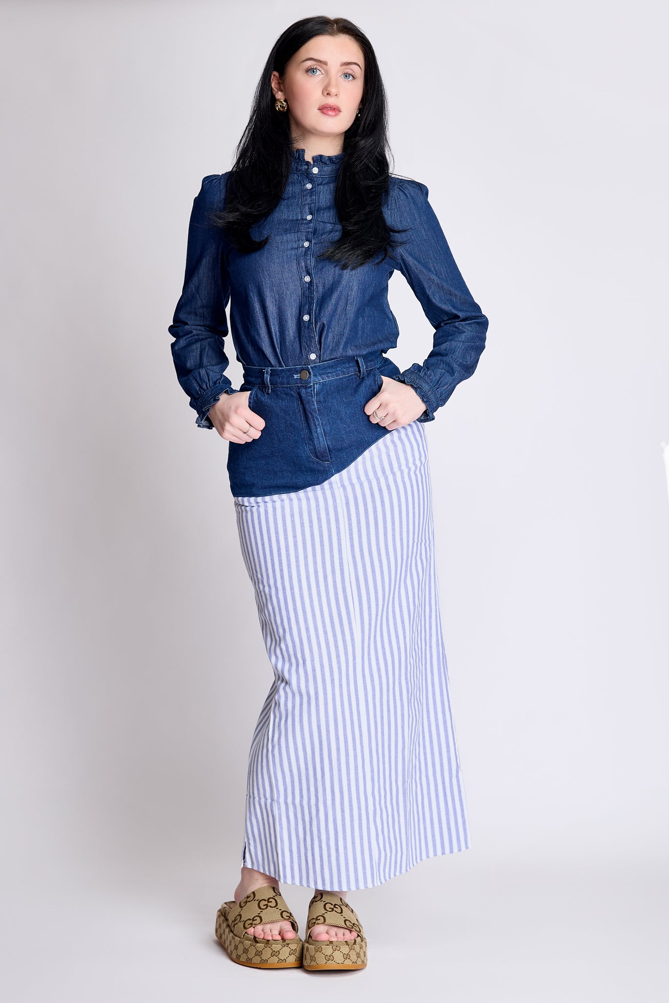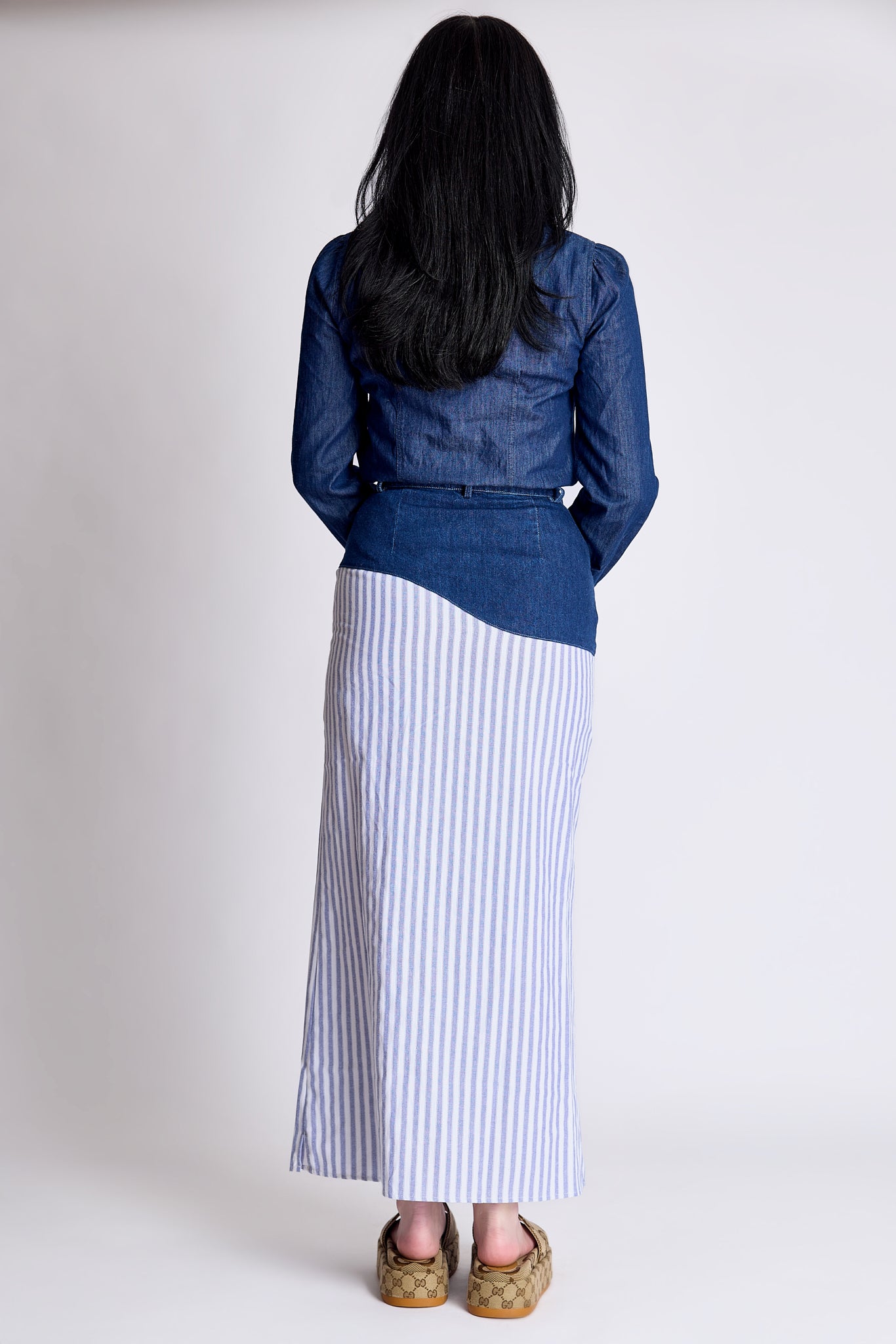 The Reimagined skirt - dark wash denim and blue stripes