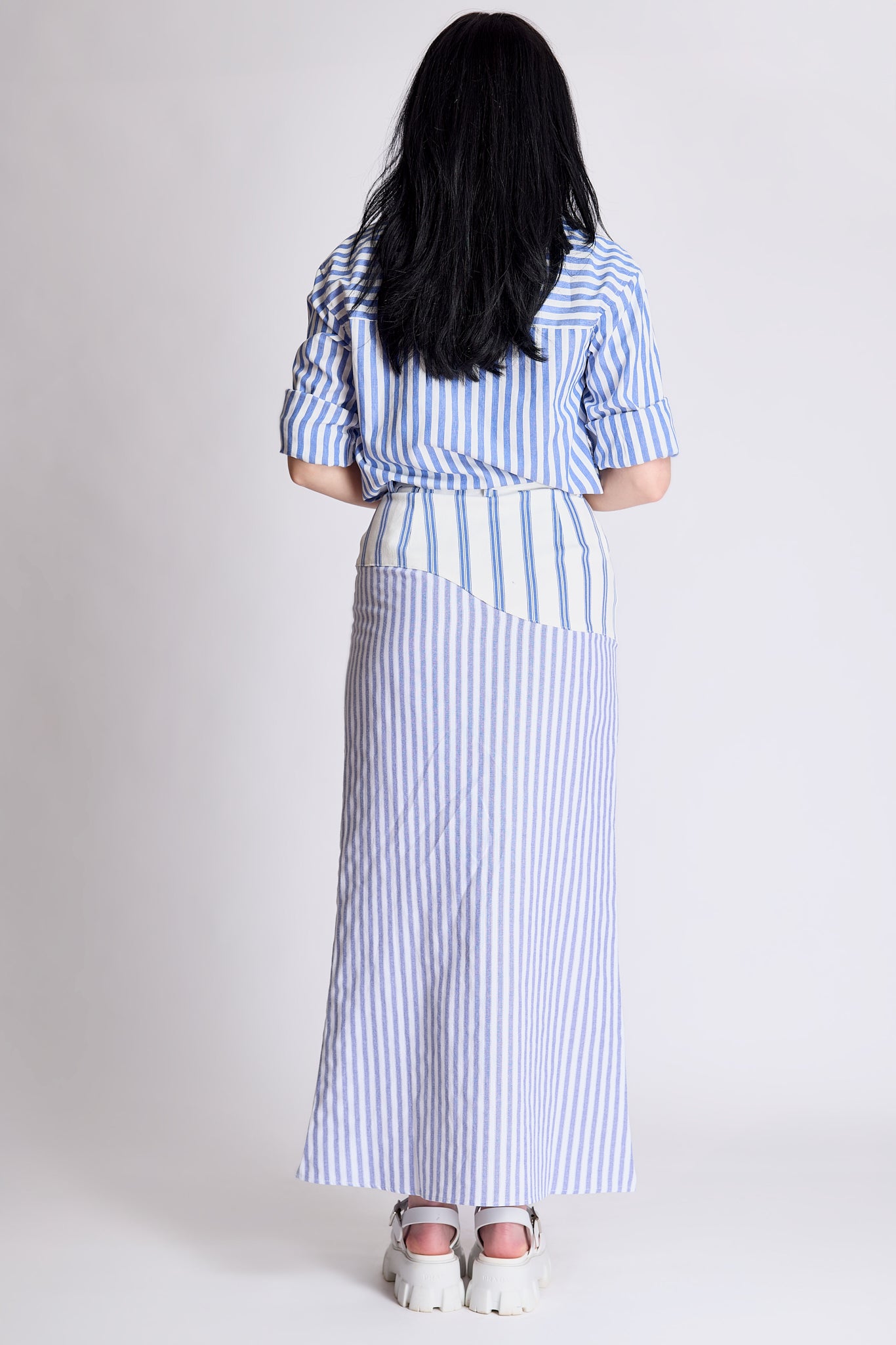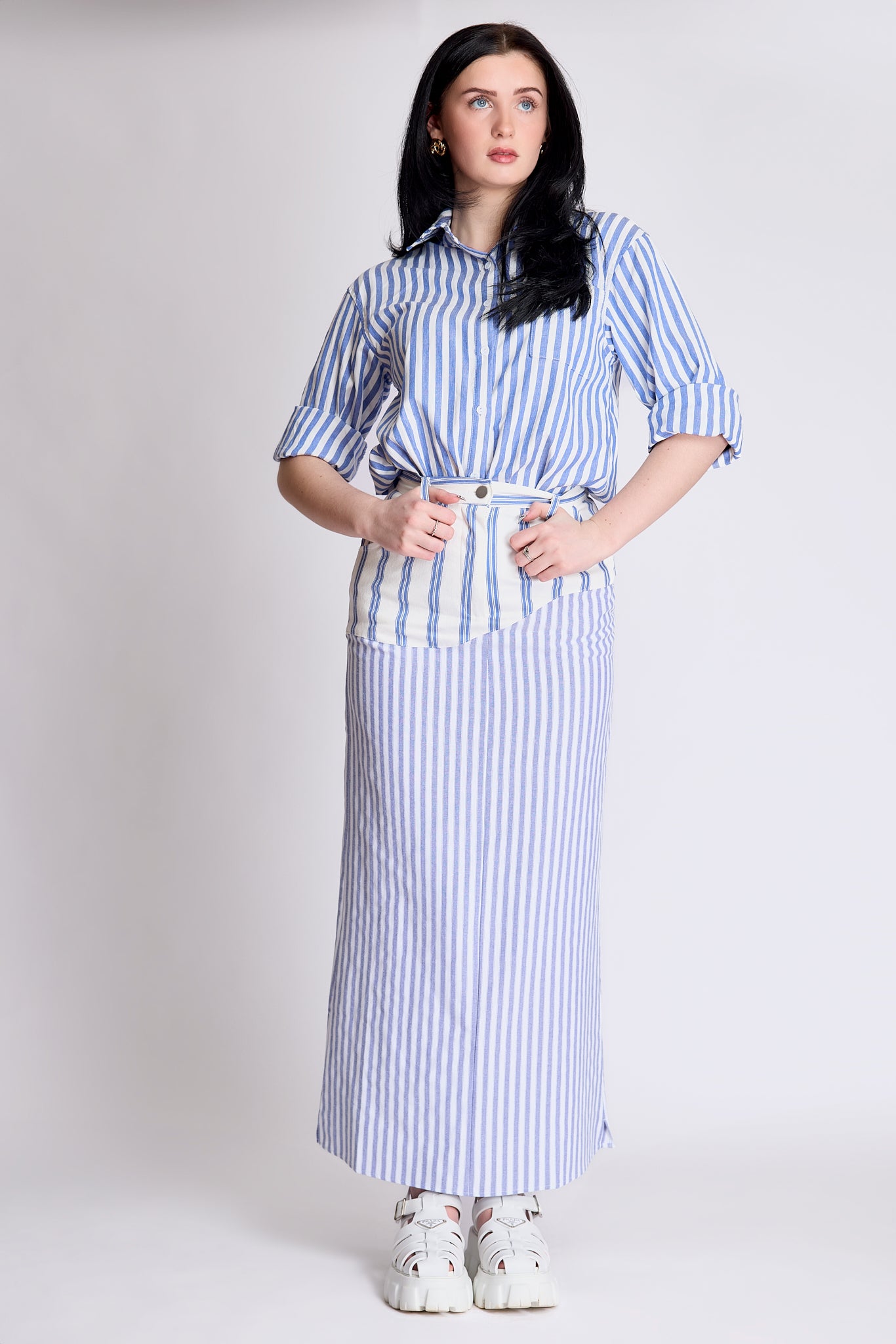 The highly coveted originalāonce crafted in denim and satin solidsāreturns with a fresh, modern twist. Reimagined in three exquisite new variations, this beloved skirt seamlessly blends the timeless structure of denim with the soft allure of cotton prints. Designed for movement and versatility, it strikes the perfect balance between classic sophistication and contemporary charm. Choose from Dark Wash Denim & Blue Stripes for a bold contrast of structure and nautical-inspired ease, Blue & White Striped Denim with Matching Cotton for an effortlessly refined tonal look, or Sage & Ivory Plaid with Matching Stripes for a vintage-inspired take on the iconic silhouette. Flattering and fluid, this signature cut is as versatile as it is elegantāwhether styled casually or elevated for an evening out. A true collectorās piece, available now in limited-edition prints.