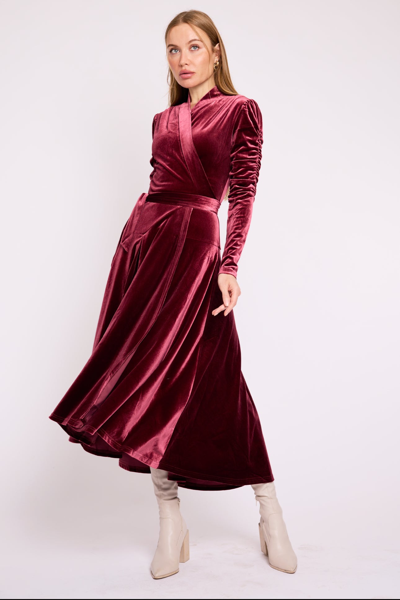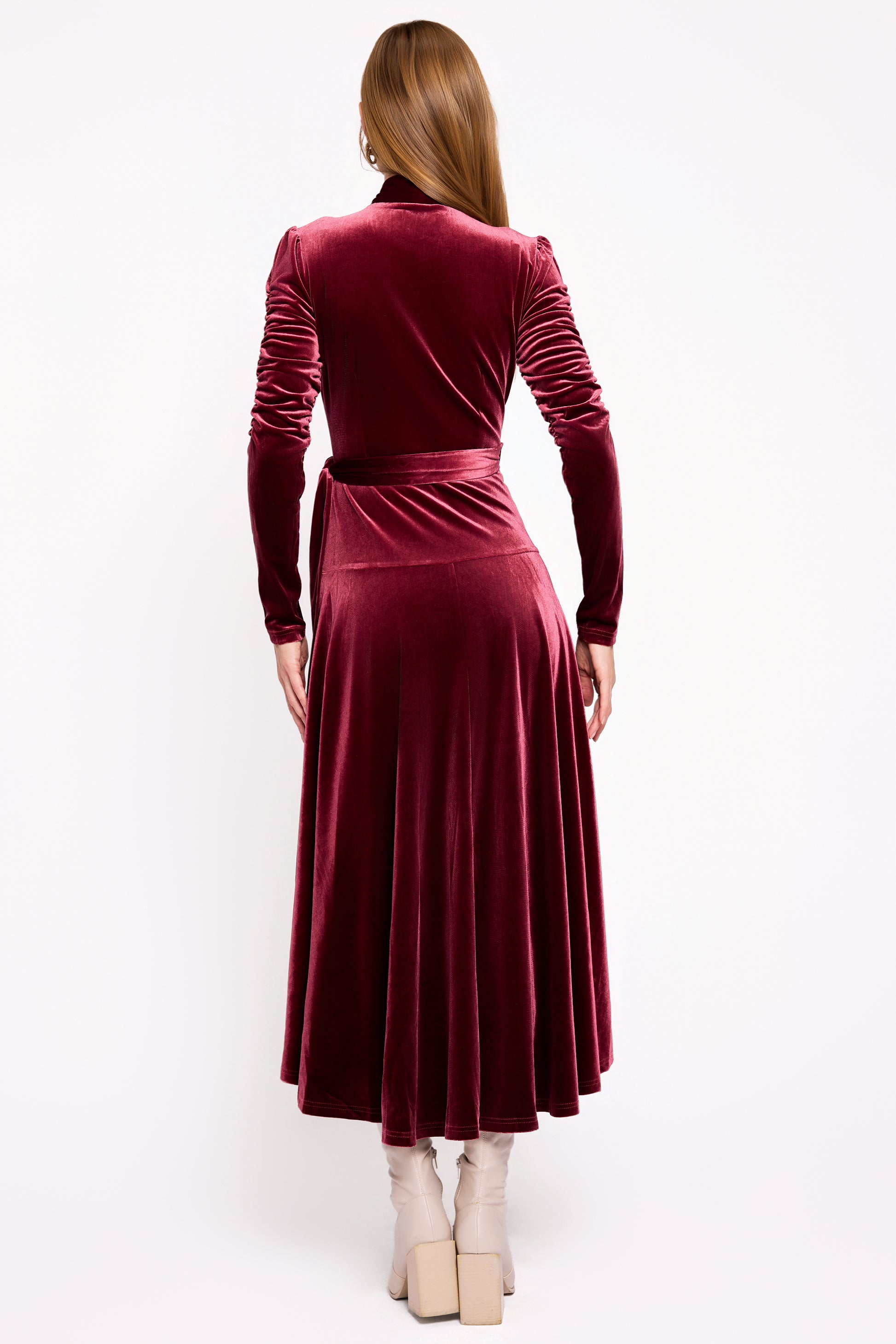 The Vivienne Wrap is the embodiment of understated luxury—a timeless wrap dress crafted in plush wine-colored velour that drapes with grace and softness. With its flattering wrap silhouette, long fitted sleeves, and subtle sheen, this dress captures the essence of refined femininity.