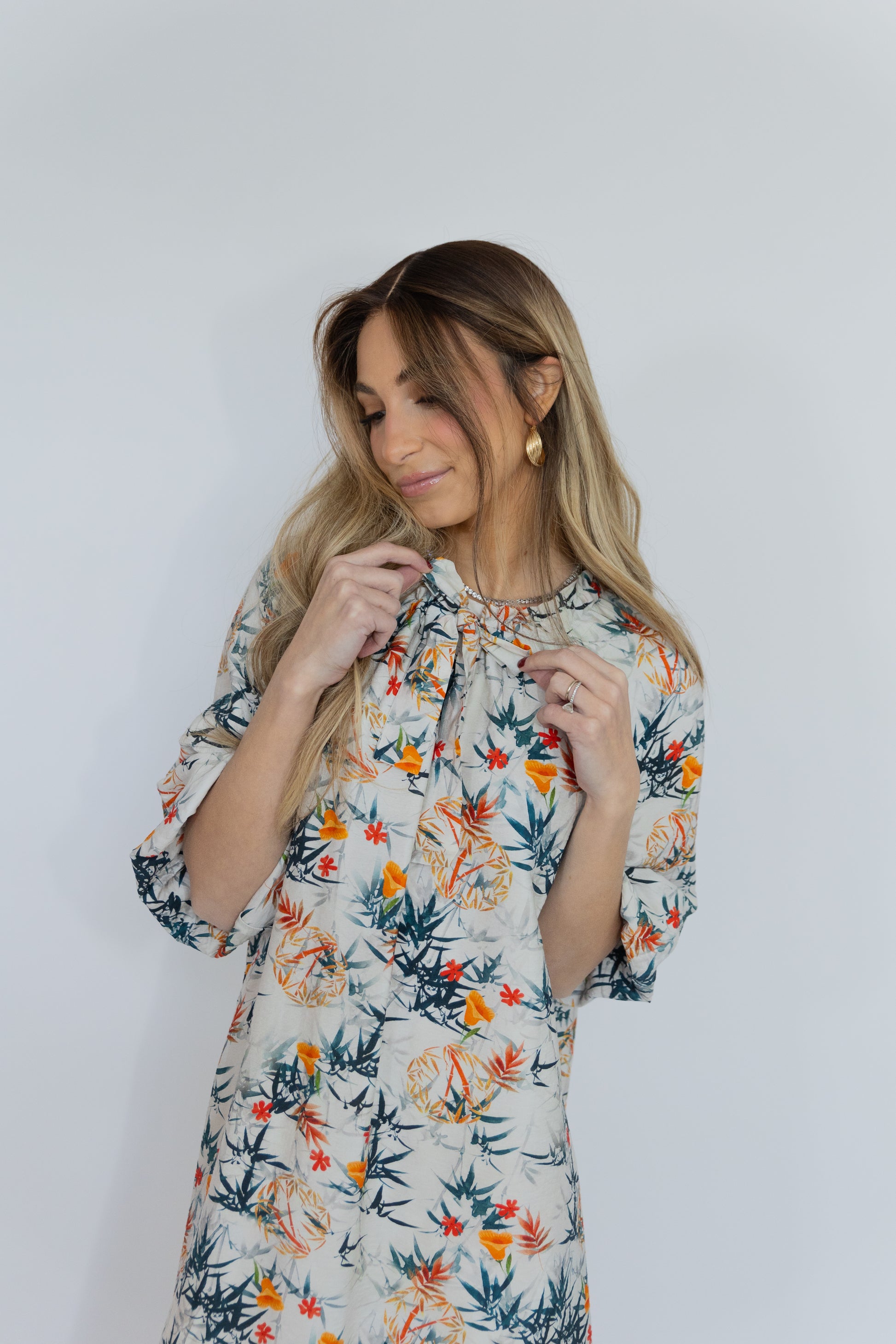 Indulge in the epitome of tropical elegance with our stunning Tropical Dress. Crafted from luxurious linen, the dress showcases a vibrant blue and tropical print, evoking the serenity of a secluded paradise. The drawstring neckline allows for versatile styling, while the loose, flowing fit creates an effortlessly chic silhouette.