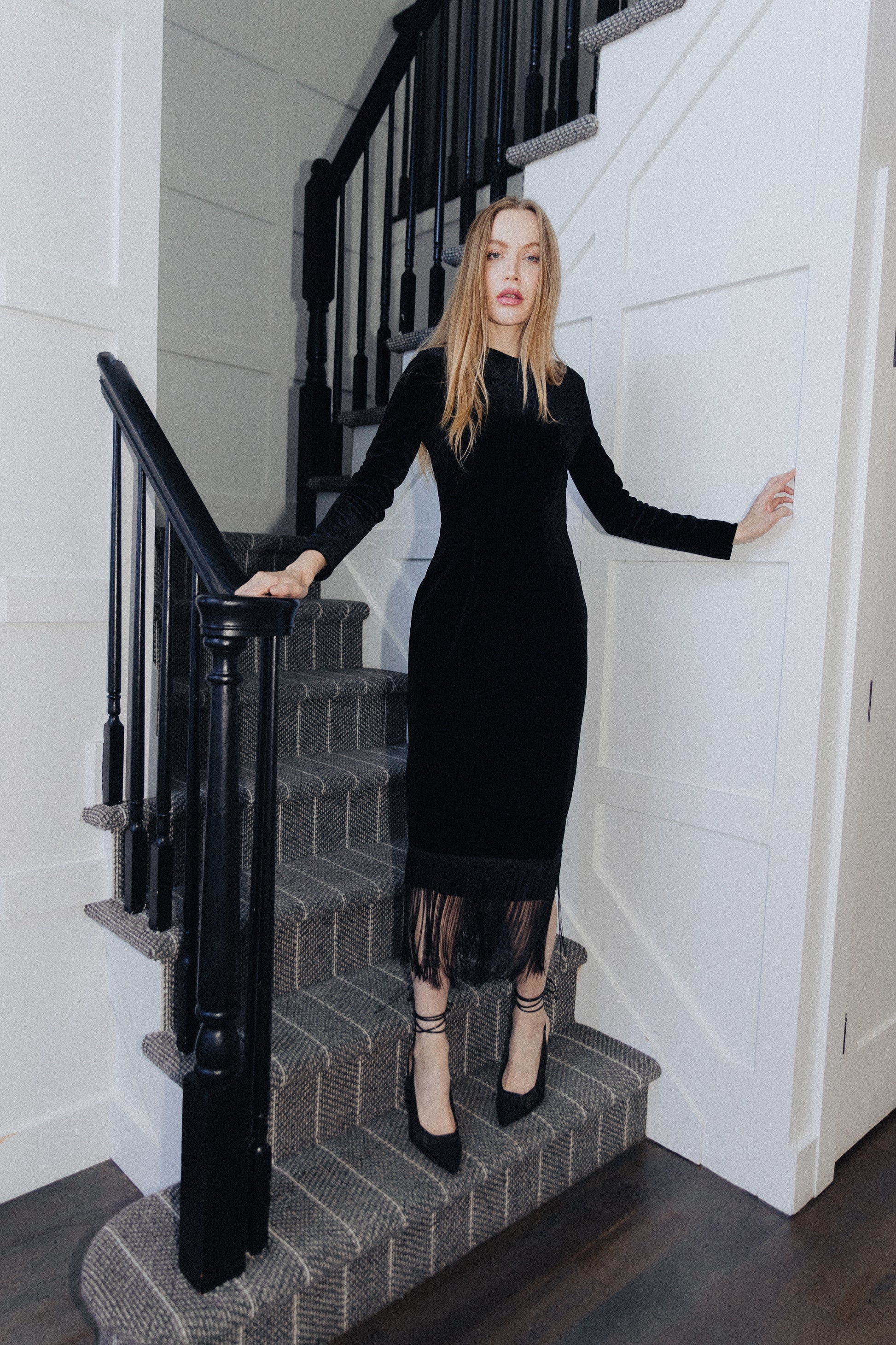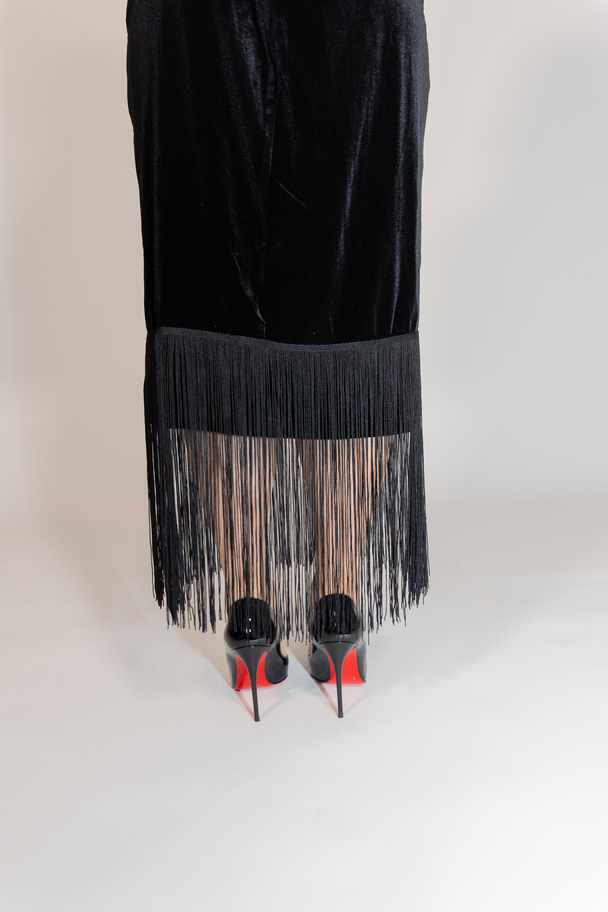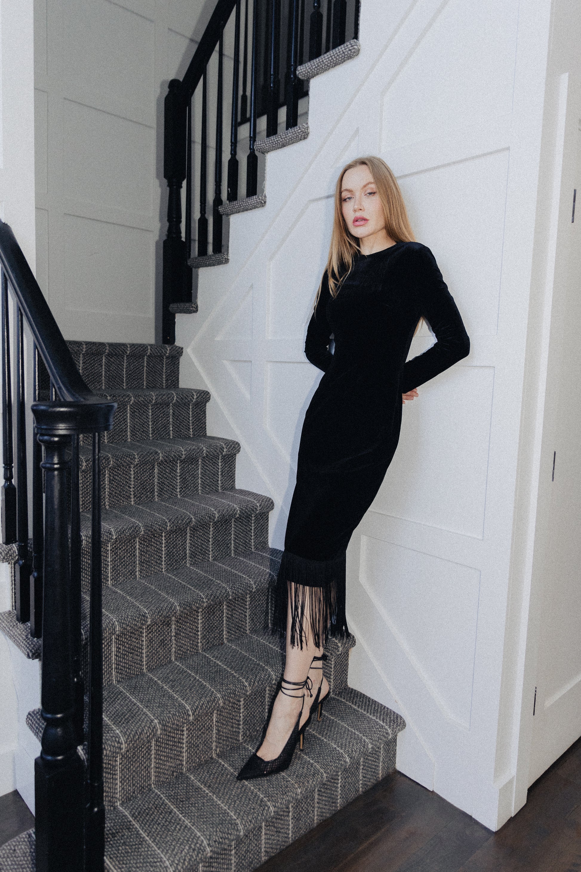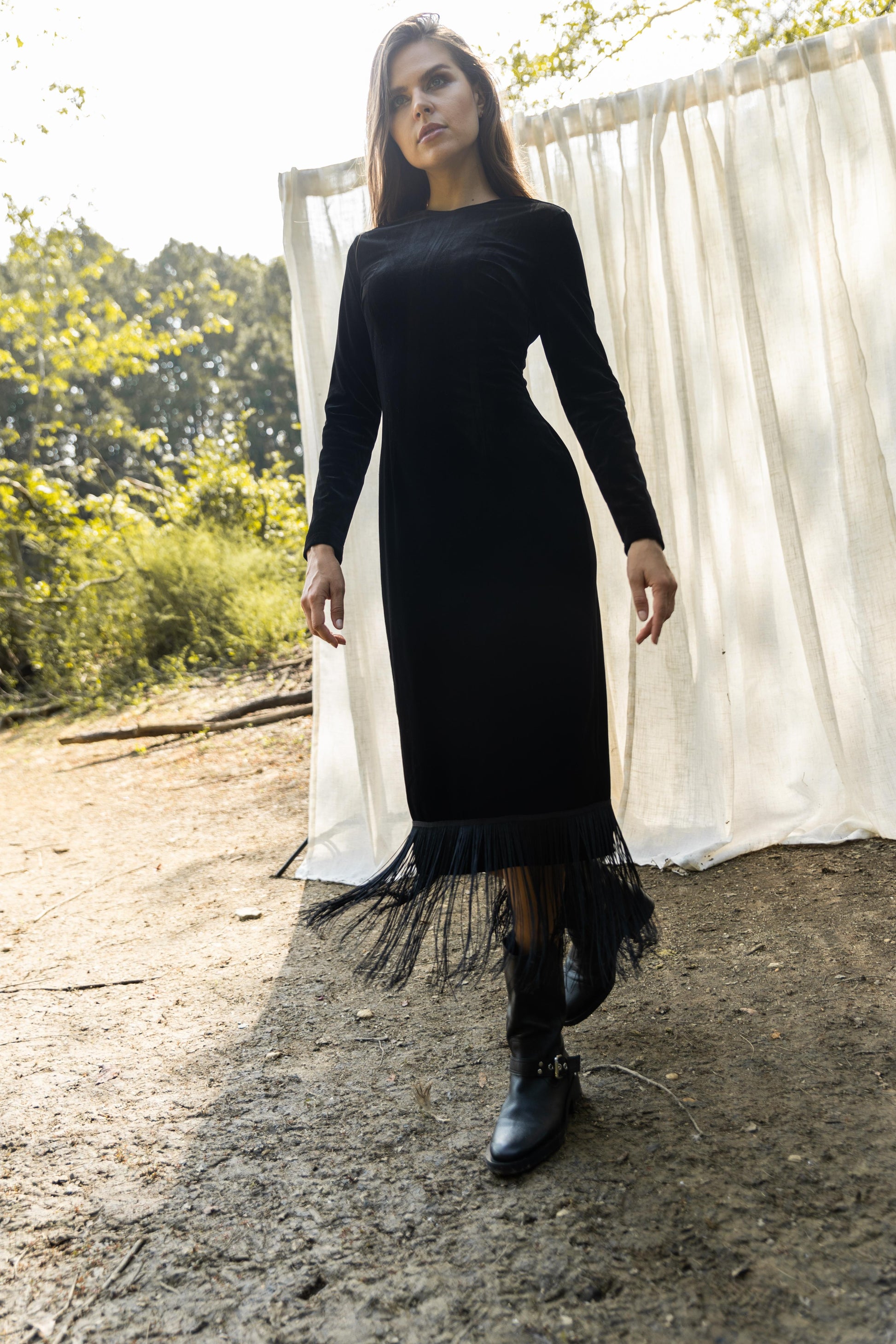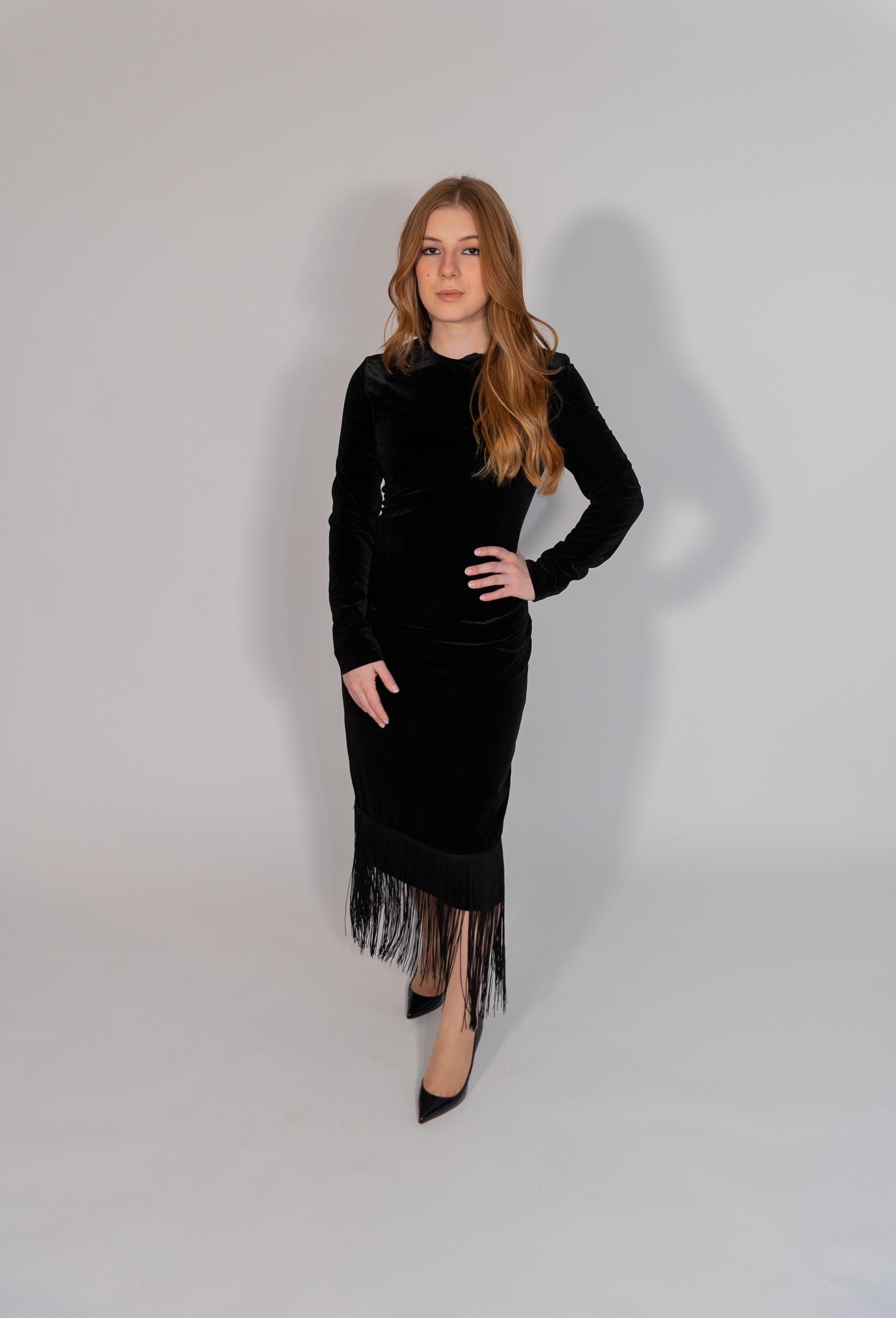 Embrace unparalleled sophistication with the Fringe Dress, an epitome of luxury and style. This exquisite black velour midi dress features a lavish velour fabric that drapes beautifully, while the fringe hem adds a dynamic and elegant touch. The carefully crafted princess seams ensure a flawless fit, enhancing your silhouette with grace and precision. Ideal for any refined occasion, the Fringe Dress combines timeless elegance with contemporary flair. Elevate your wardrobe with this stunning piece that promises comfort and a lasting impression. Shop now to experience the ultimate in sophistication and style.