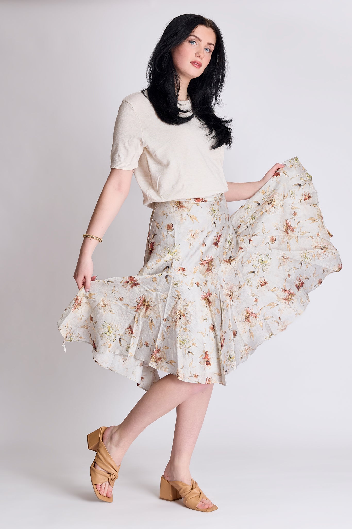 A poetic fusion of soft movement and effortless beauty, The Watercolor Handkerchief Hem Skirt is designed for the woman who embraces refined romance. Featuring an ethereal floral print reminiscent of delicate watercolor brushstrokes, its muted blues, warm neutrals, and soft rust tones create a look that is both dreamy and sophisticated.