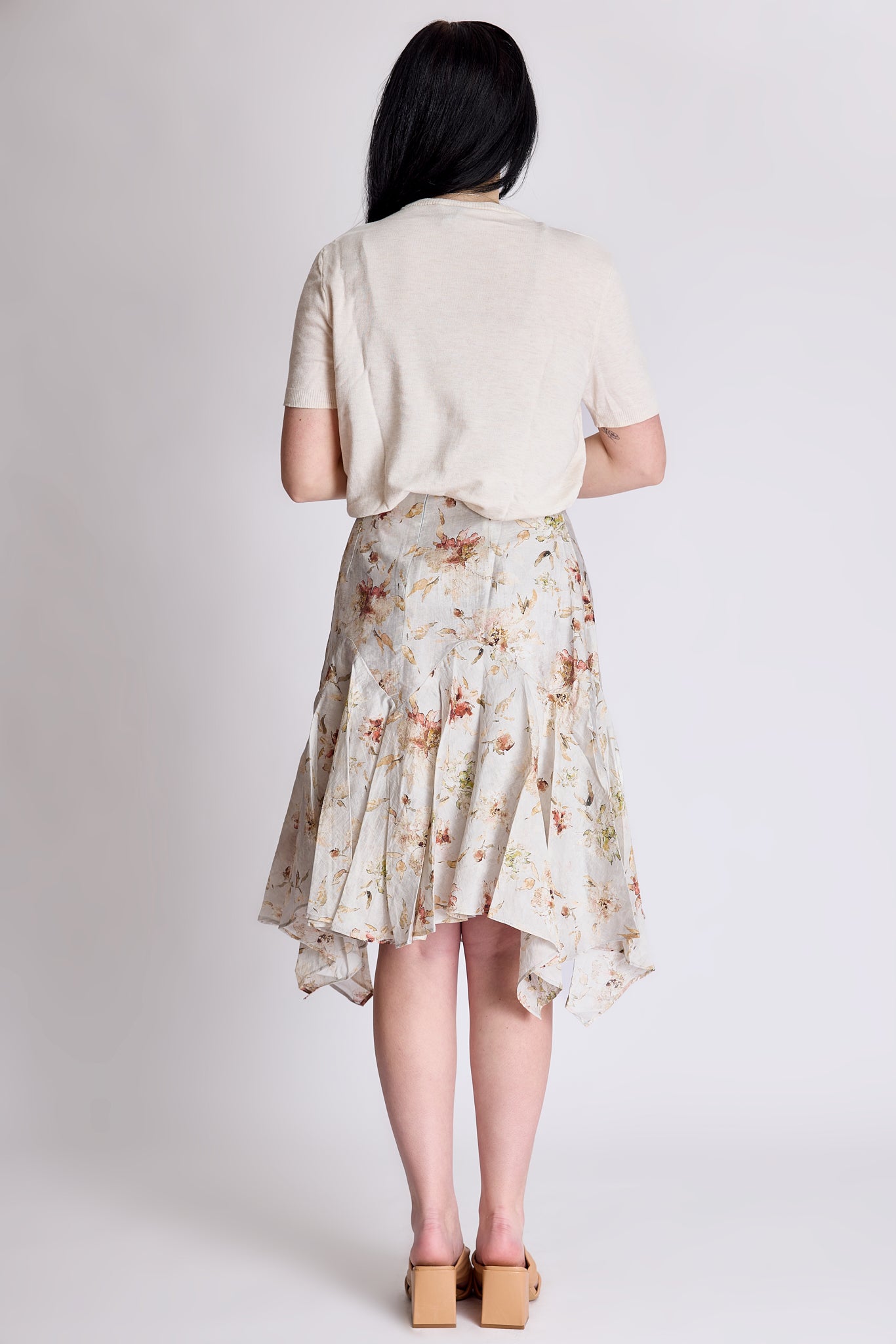 Crafted from lightweight, breathable fabric, this skirt drapes beautifully, while the asymmetrical handkerchief hem adds a free-flowing, artistic touch. The tailored waistband ensures a flattering fit, and the gentle flare enhances graceful movement with every step.